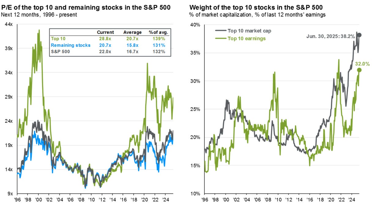 Weight of top 10 stocks back to 40% of S&P 500, highest ever. Outsized MAG7 impact on index vol is evident through sharp vol spikes last few years as correlations spike and index vol moves closer towards average single stock vol (which is substantially higher right now than at any point in last 20 years.)