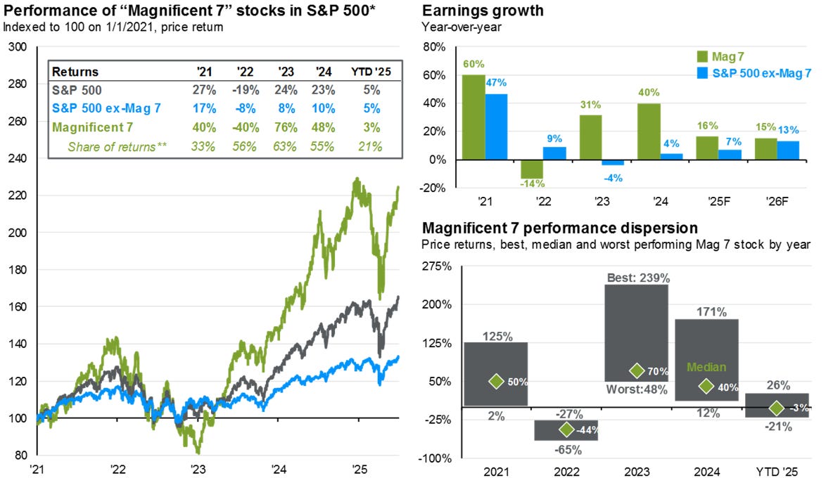 We’ve seen major multiple expansion since April/May in broader market but more so for large cap stocks. YTD, however, much more balanced earnings growth between MAG7 and rest of market.