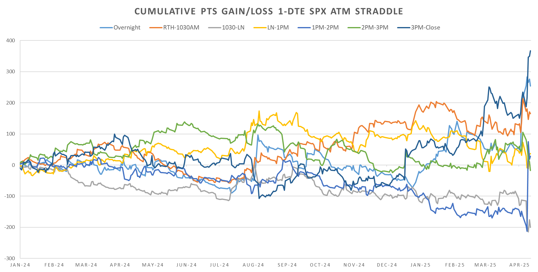 ~300pts being long the 1-DTE straddles, ~540pts being long the RTH session 0-DTE straddles. Last 2 hrs straddles down ~105pts last 6 days.