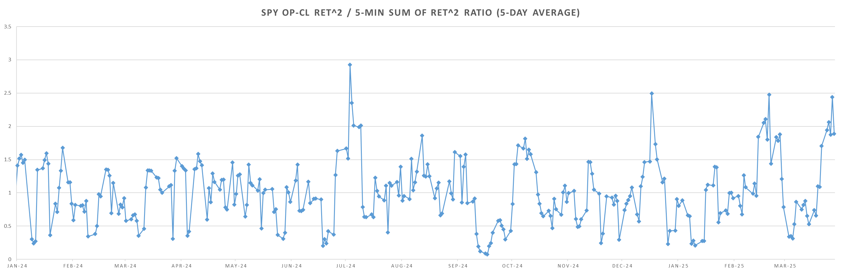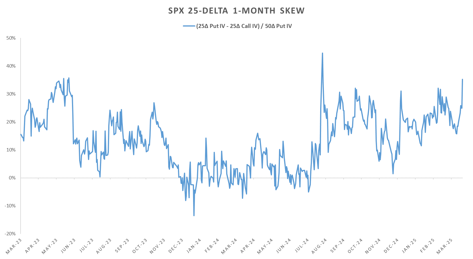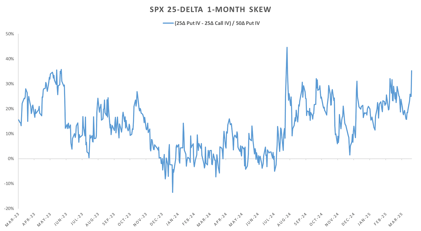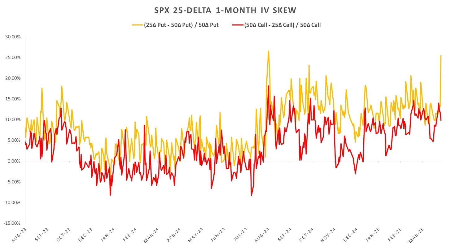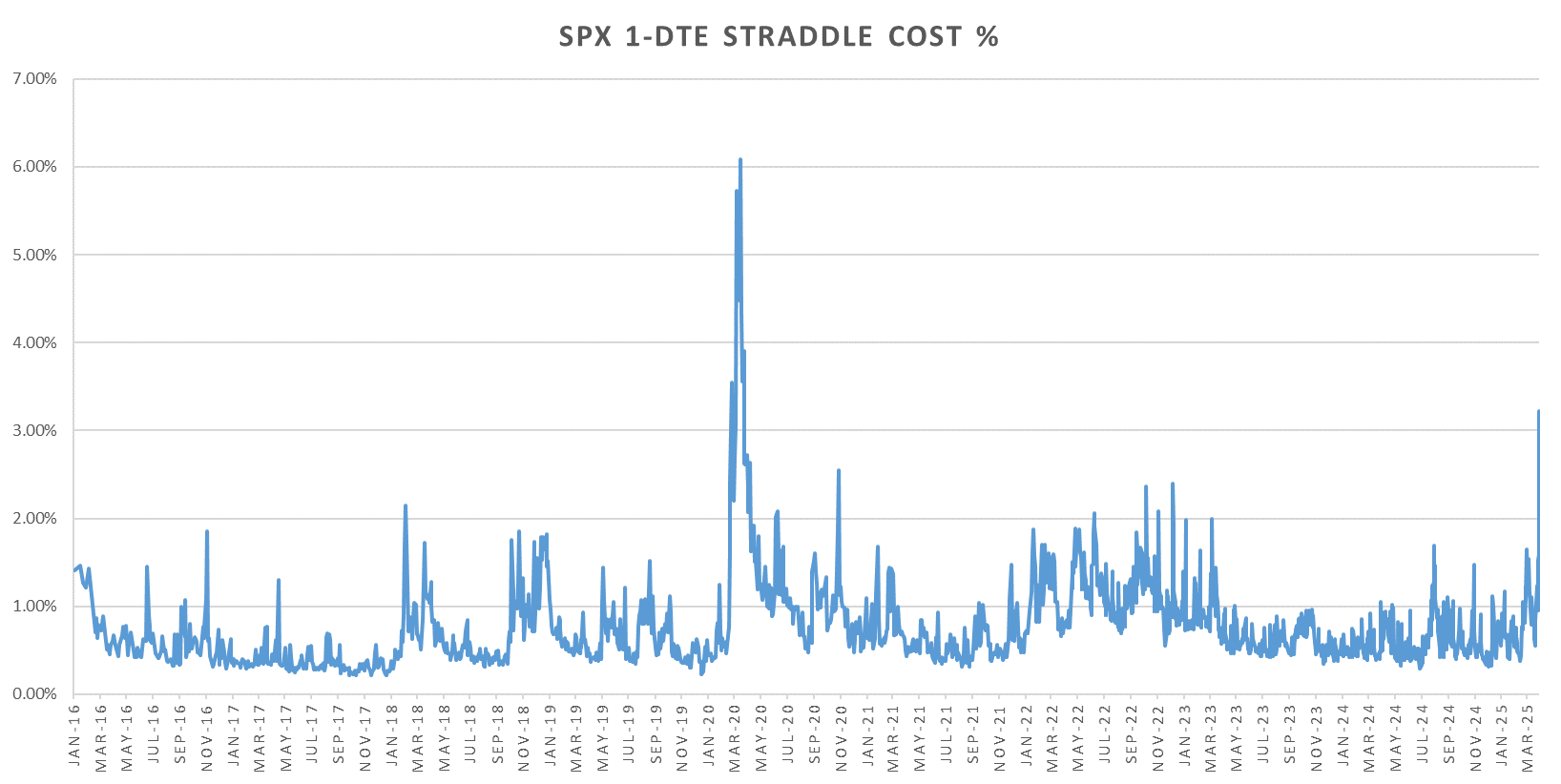 1-DTE Straddles were oddly tame up until Friday. Tariff day straddles we’re trading ~150 bps and even Thursday after the announcement we saw ~160bps straddle… The real risk came on Friday close with a 320bps weekend straddle, doubling in a day from already elevated levels. Realized vol was severely underpriced going into end of last week…