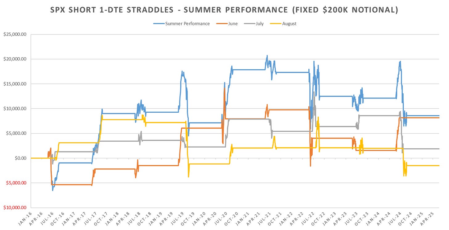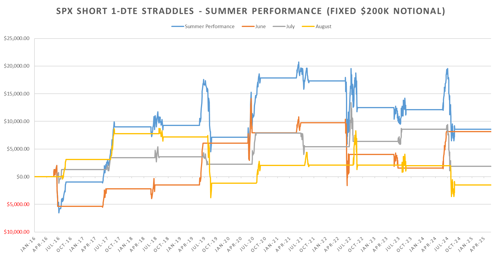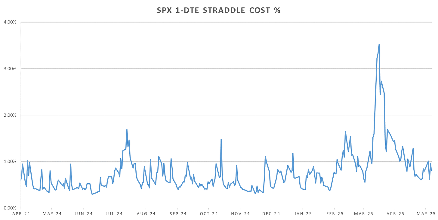 SPX now ~2 full weeks unchanged from the initial China tariff cut on May 12th. We’ve had a number of other headlines but SPX has been glued to 5900 level despite any gap up/down overnight price action. Earnings season concluded now with above average % beat on the initial guidance. As we enter summer June usually sees lower than average volatility up until end of month / July & August where things usually get heated again (at least over last 10 years June on average best performing month for short SPX 1-DTE straddles with August the choppiest):