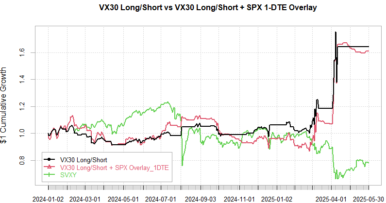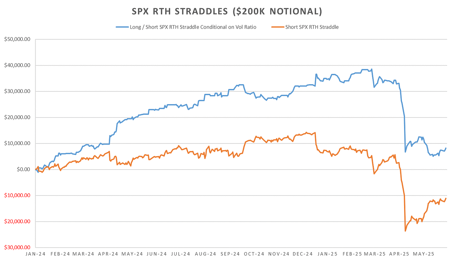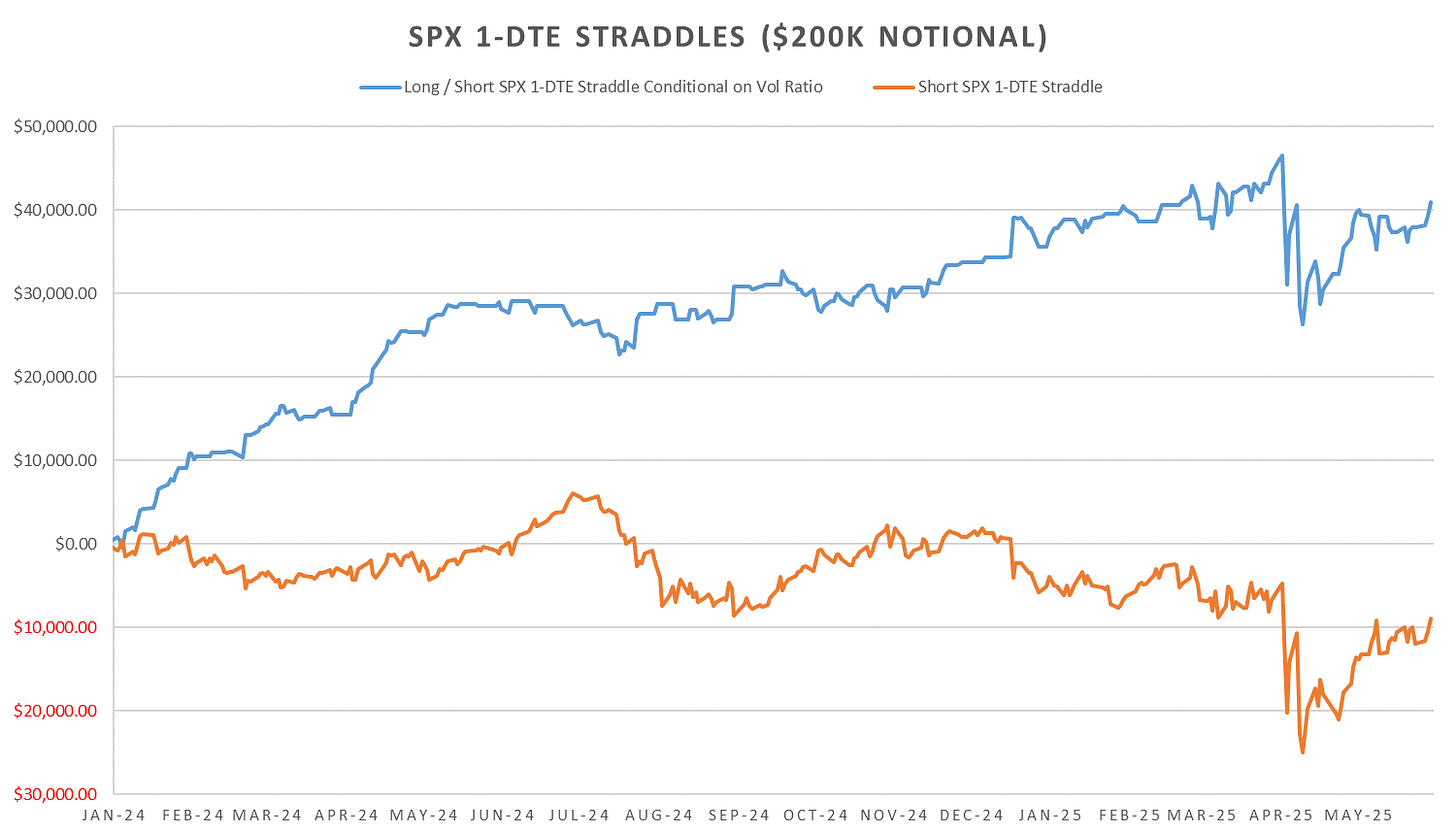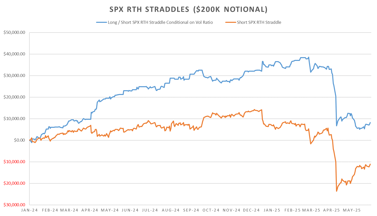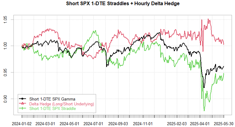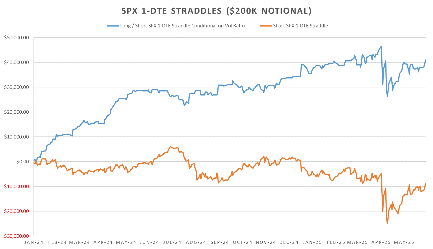 Fading extremes in intraday trend/mean reversion for 1-DTE straddles shows pnl recover almost back to pre tariff panic highs. As previously mentioned fading extremes works well when markets are largely calm, biggest losses come during periods of extreme vol in one direction.