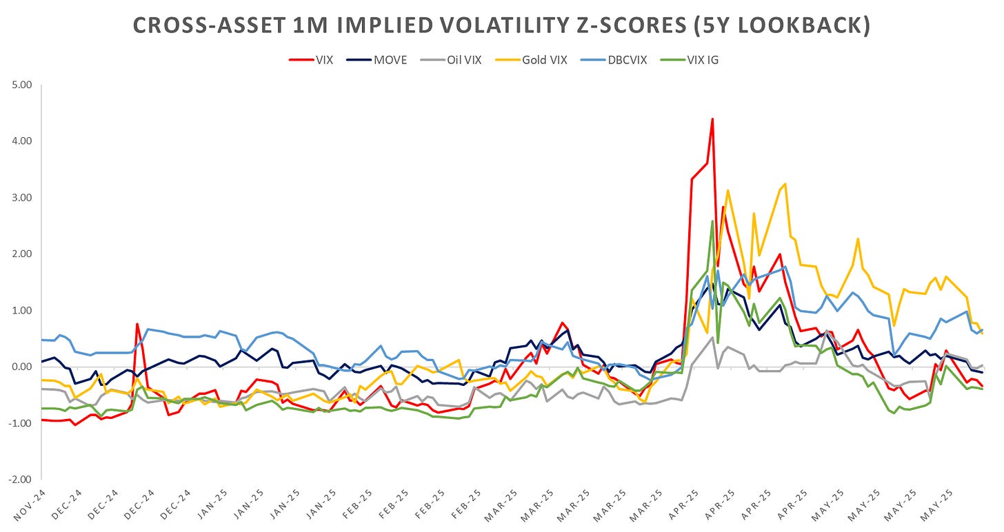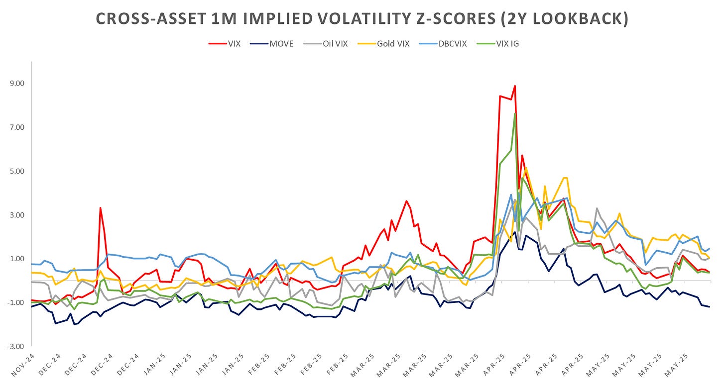 Cross-asset implied vols down across the board last week, although Gold surged Monday morning on renewed geopolitical concerns after the Ukrainian strike on Russian nuclear bombers over the weekend (just writing this out feels ridiculous and the fact that market was barely down 10bps with vols now red across the board speaks on some incredible complacency…)