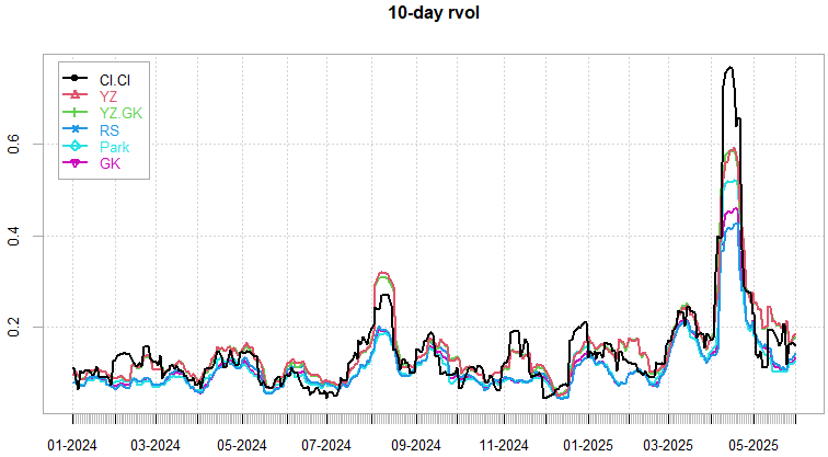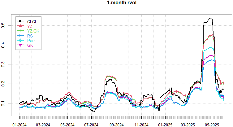 Can see the divergence between intraday range based vol estimators and the estimators that account for overnight gaps. Intraday vol now back to average levels for 2024.