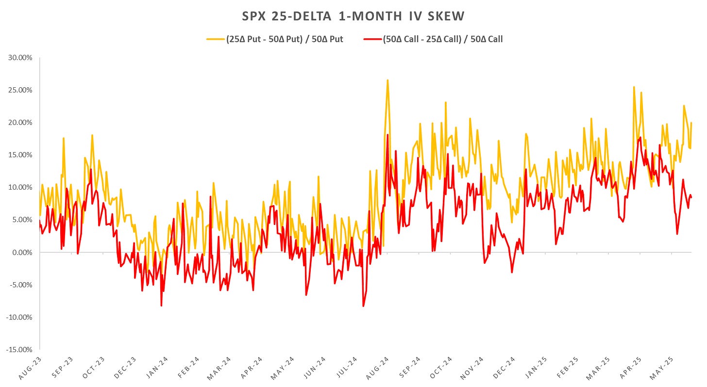 SPX put skew continues to trade top %-ile up till now, the moving component mostly call side. Panic grab for calls we saw a week ago larger over.