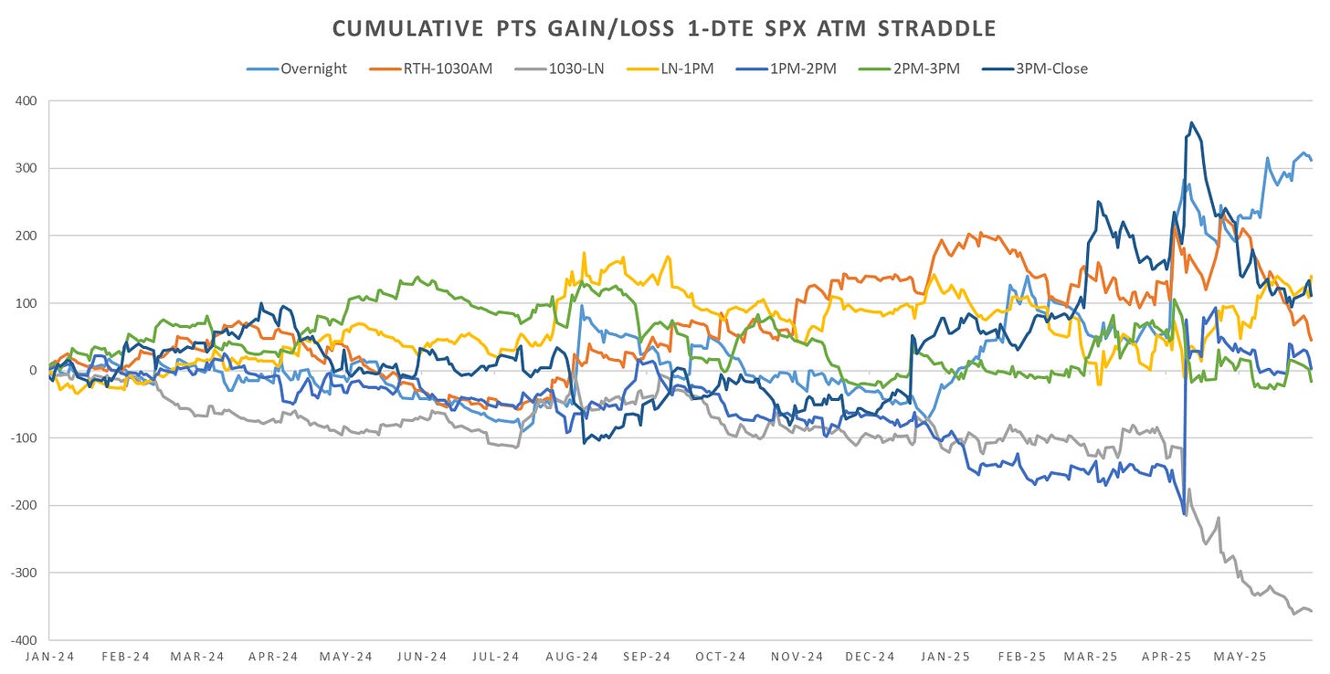 10:30am to London Close falling off a cliff since April. Every single overnight / opening move we’ve had gets retraced in a monotonous way into London close. Overnight straddle performance back to peak (almost straight line since Jan 2025.)