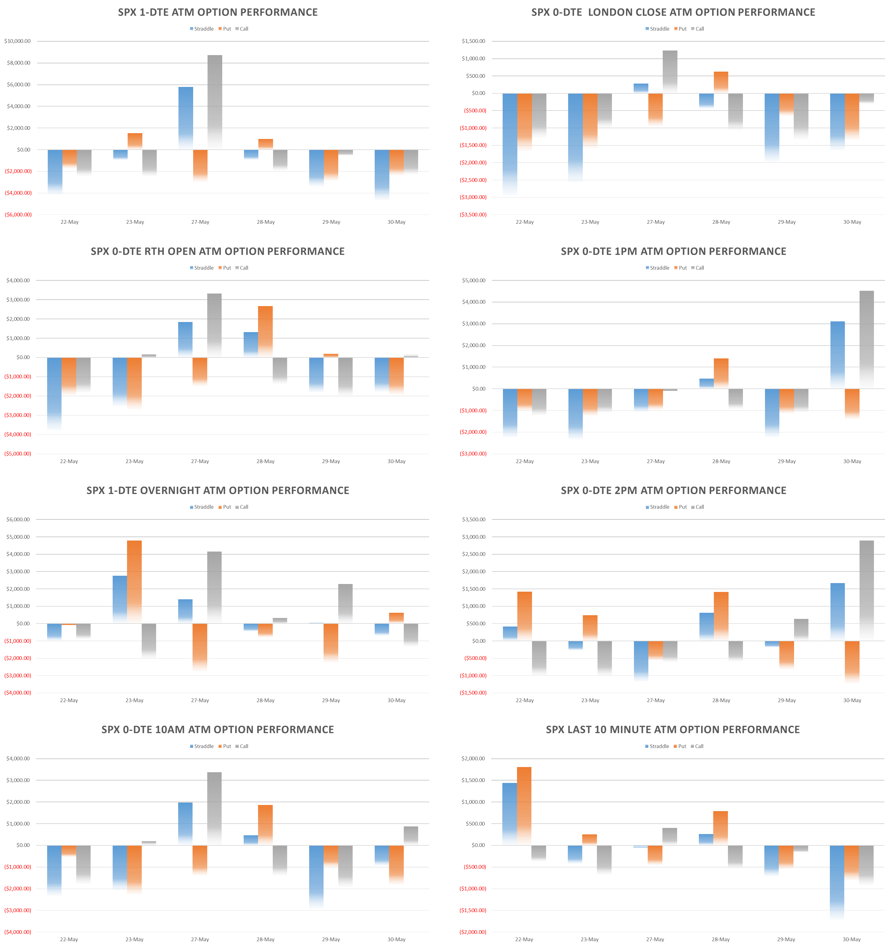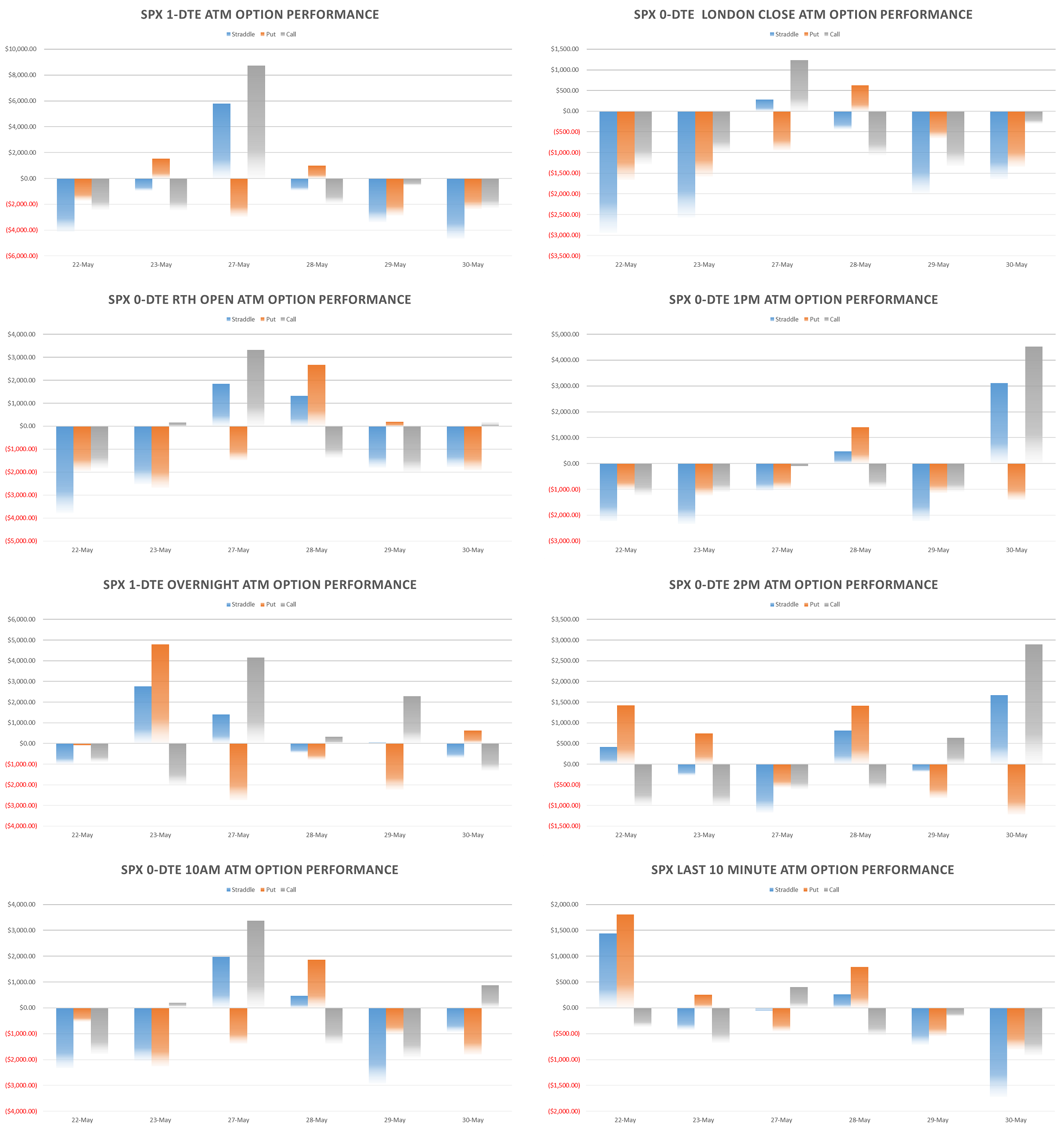 SPX 1(0)-DTE Straddles showing clear patterns of positive overnight performance for long straddle positions & . SPX Straddles opened at US RTH session open down ~67 pts over the past 6 trading days, overnight straddles up 20pts. Biggest losers are straddles opened at London Close (11:30am), down 93pts over 6 trading days.