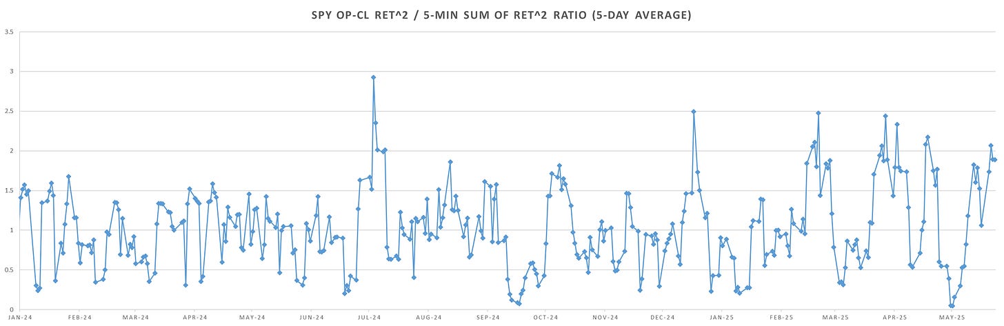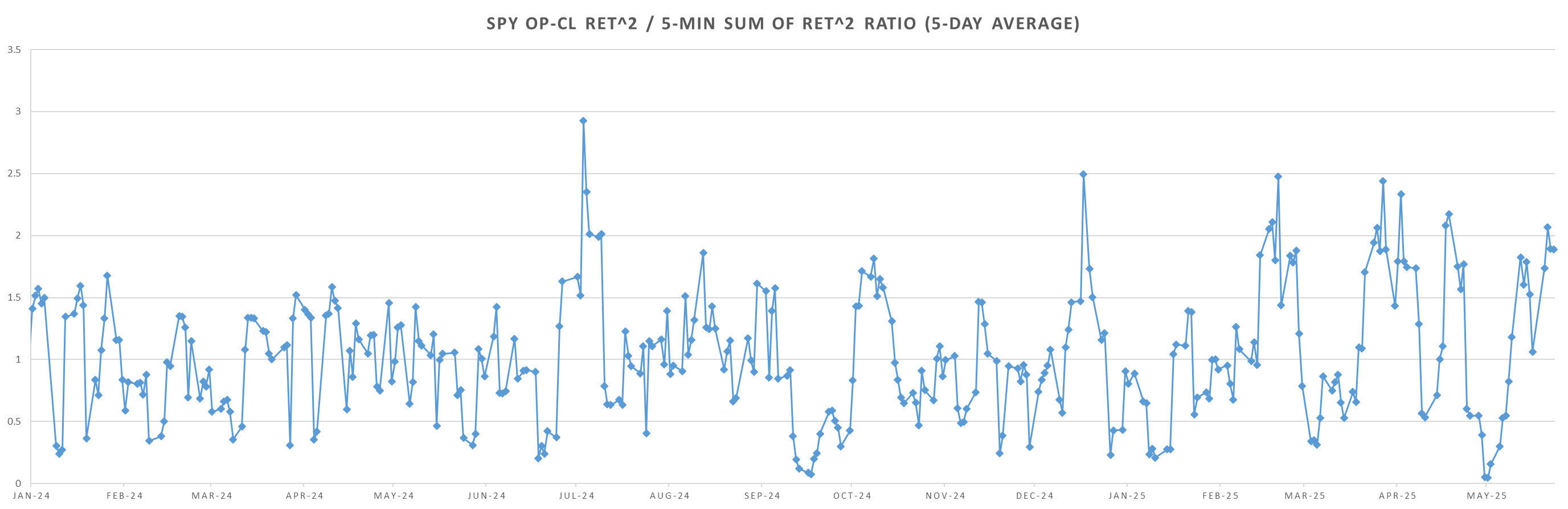 Looking at the ratio of 5 min variance to op-cl variance we see strong trend intraday. All dips/rips overnight bought in uniform fashion throughout the day.