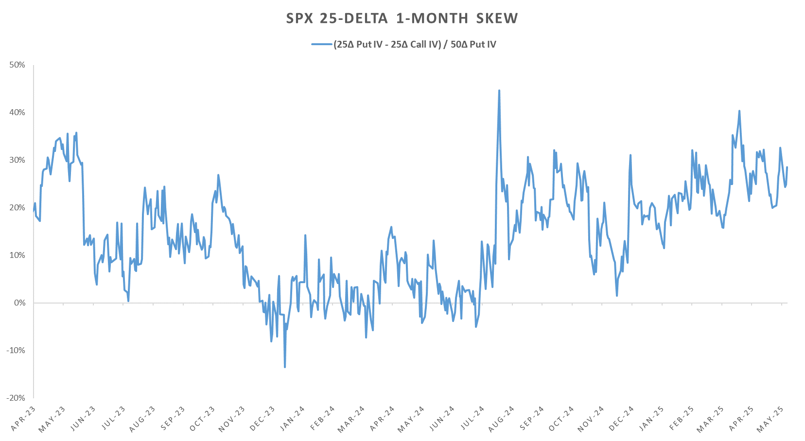 VIX-Futures have been trading ~20 with entire term structure up to 2026 trading within 2pt range. This shape in line with uncertainty surrounding tariffs and general macro environment.