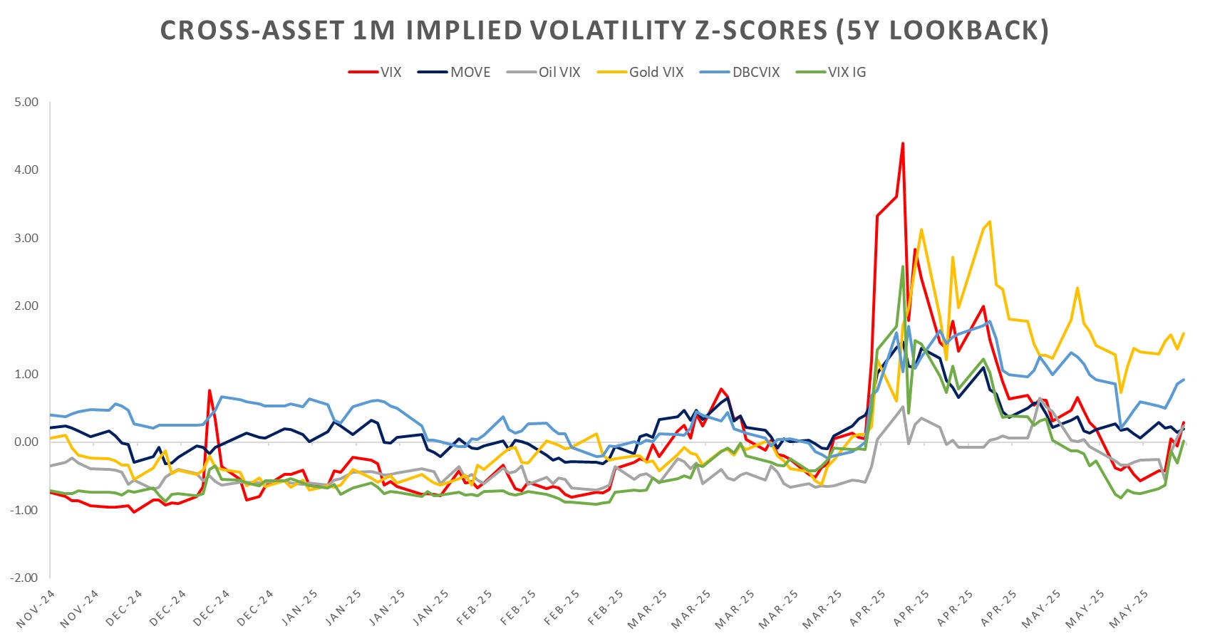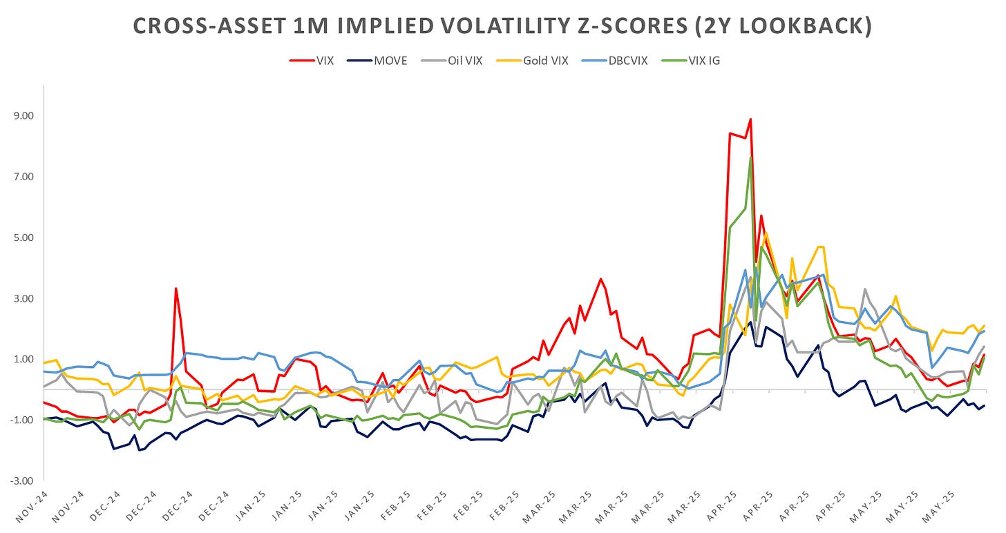 Market finally had a small pullback last week, S&P 500 sold off nearly 4% from the peak of the rally into end of week. VIX traded back towards 25 purely on spike in implied correlations after European tariff headlines (already smoothed over after weekend “talks going well” headlines…) We have a relatively light week in terms of data, GDP / PCE Thursday/Friday and in terms of earnings NVDA reporting after close on Wednesday. That’s around 11% of NDX & ~6% of SPX market cap reporting on Wed with related knock-on effects on rest of AI stocks. Can clearly see market shifting to higher implied correlation regime (reflecting more systematic risk vs idiosyncratic) as SPX is just few % off ATH yet we see VIX putting in a higher floor (with single stock implied volatility [VIXEQ] EQUAL to Feb / Mar lows, meaning this higher ivol floor is purely due to higher implied correlations, not higher single stock vol.