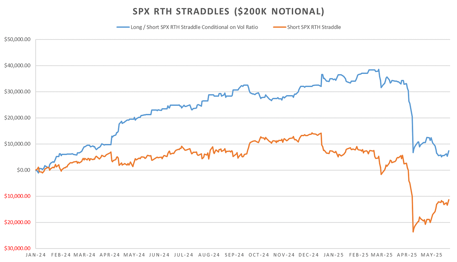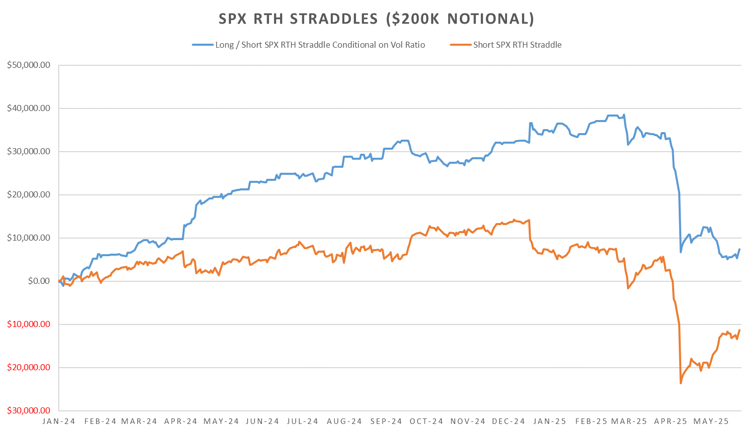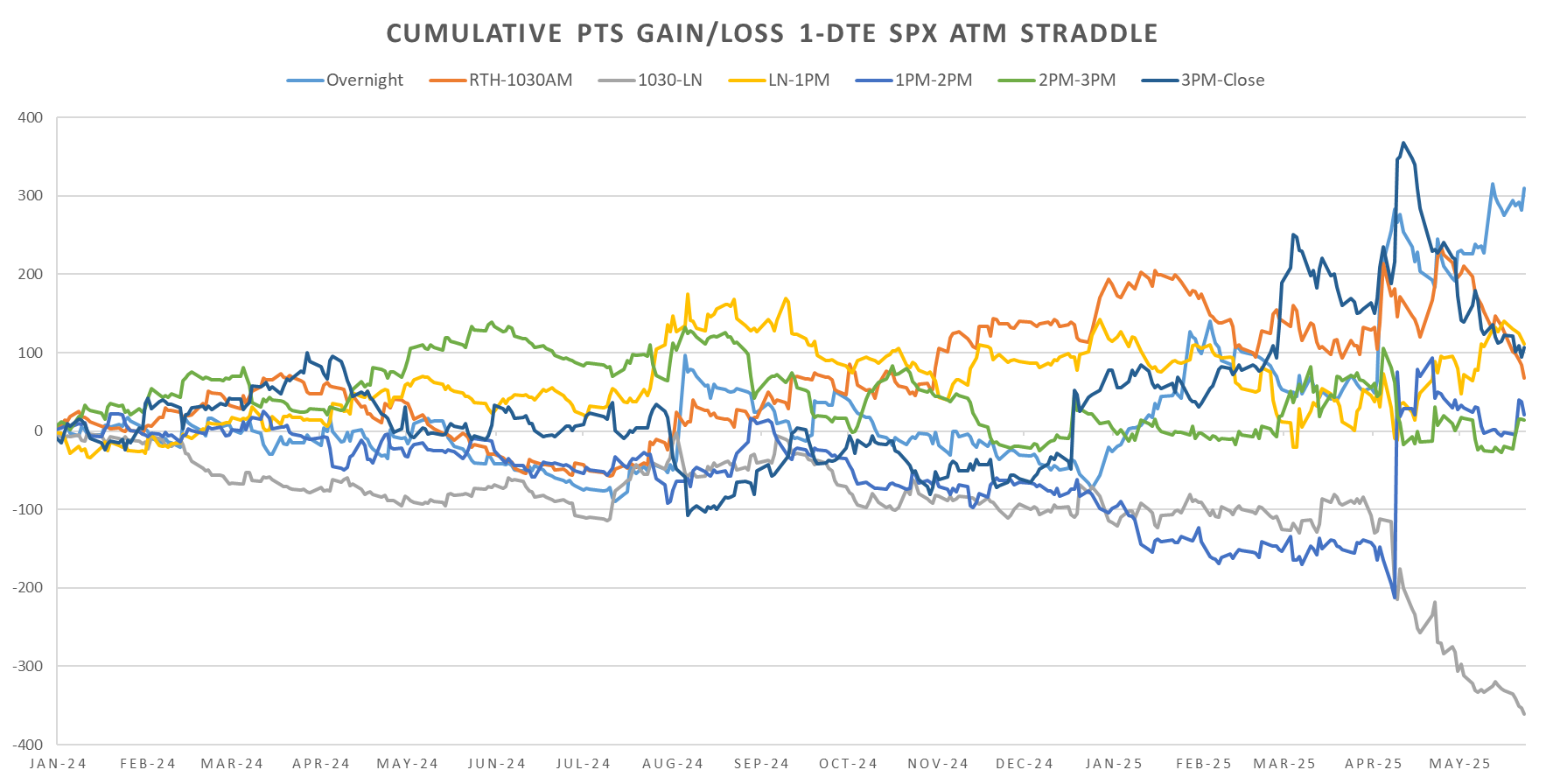 Looking at the cross section, overnight period largest contributor to long straddles PnL YTD, up ~ 400 pts. 10:30AM - London Close ~250pts down (fades overnight + first hour moves into london close.)