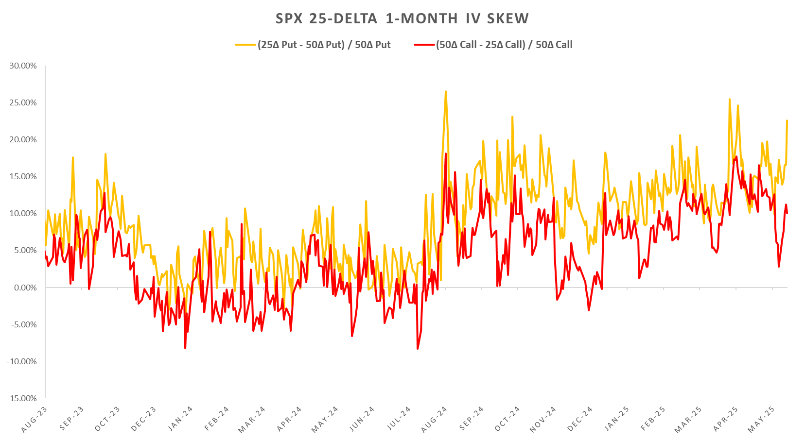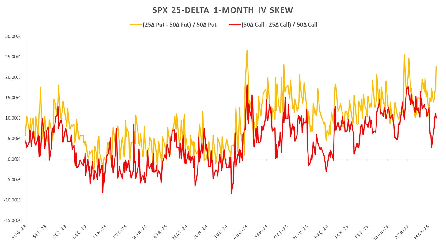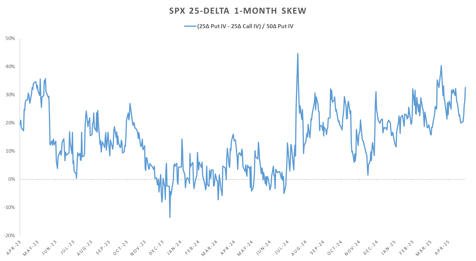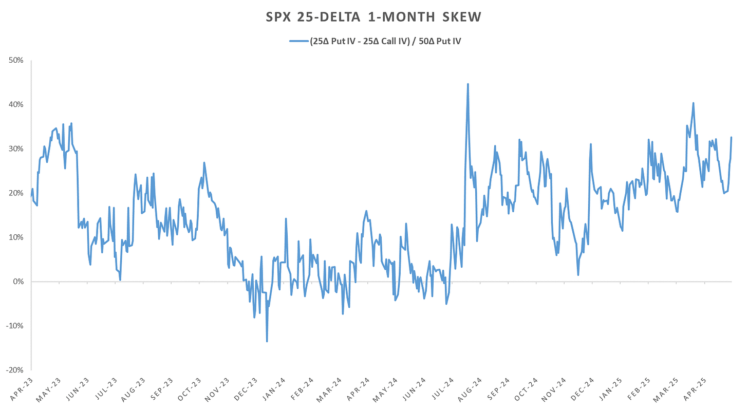 Term structure went out flat / slight backwardation in the front into the weekend… ofc the tweeter in chief walks everything back over the weekend and we see everyone puking hedges today… Still no strong bias here, its expected after a large vol episode but now nearly matching Covid in duration of no new trades triggered. I don’t really see us going substantially below 20 with trade drama still set to go on till July-Aug (and likely wayy longer). Problem is entire curve is flat around 21 now so there’s very little carry even if market goes nowhere (need either correlations back to lows, which would require trade drama to end or single stock vol to crater, which is also unlikely given the AI hype in tech stocks…) Not much to do here…