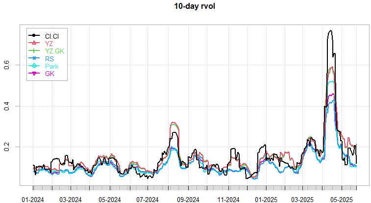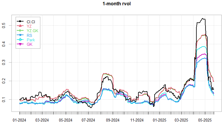 Range based vol estimators barely had any jumps last week, YZ estimator still above 20 since it accounts for the overnight moves.