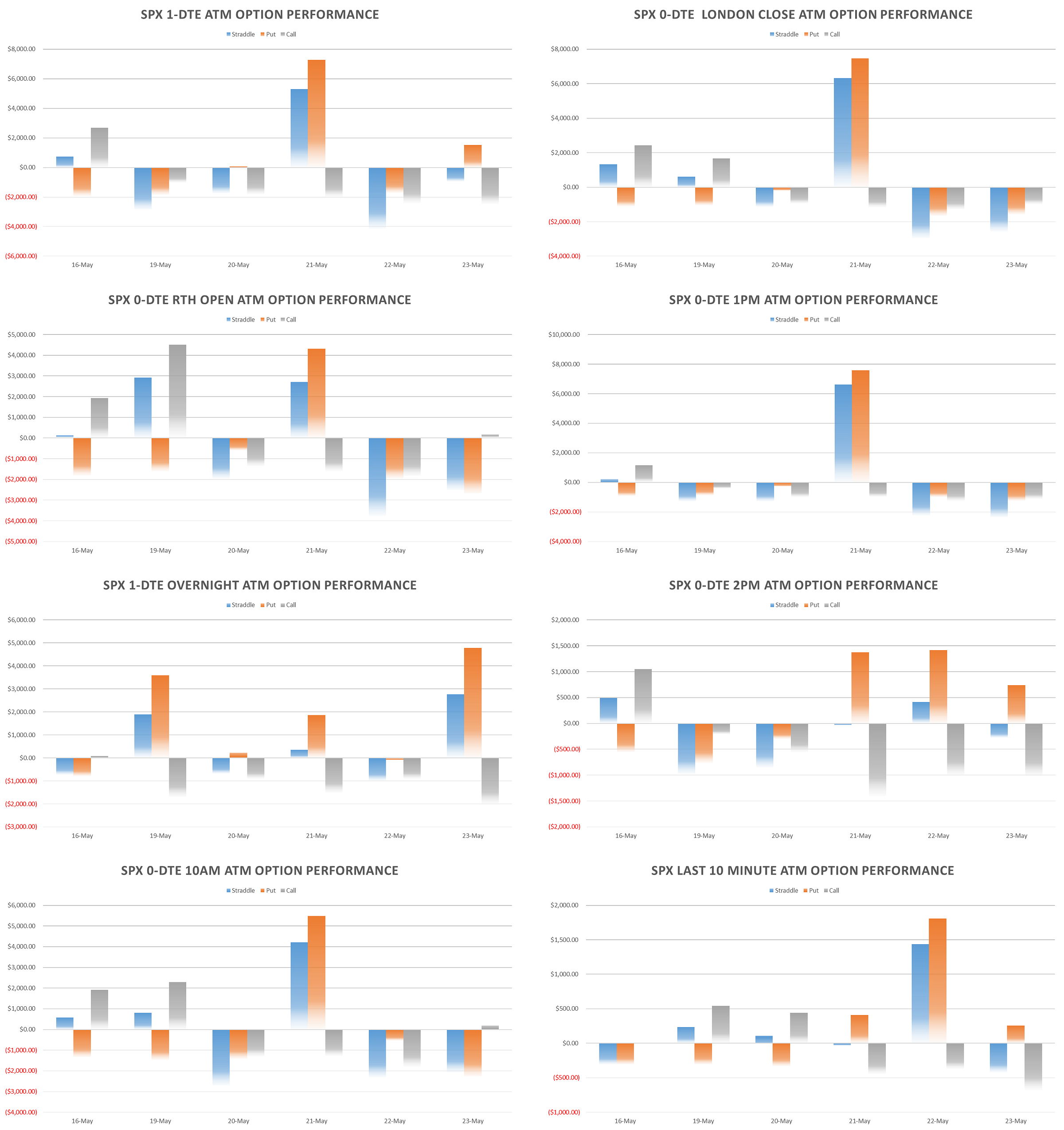 Apart from Wed drop paying out, straddles across the board lost money last week. 1-DTE calls lost money 5 days in a row as upside momentum stalled. Big win for last 10 min straddles on Thursday into close (EoM trade coming up this Friday.)