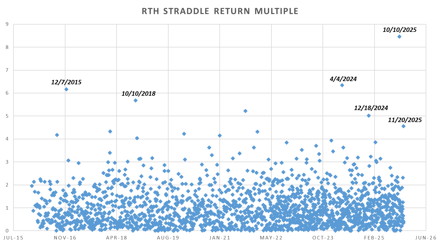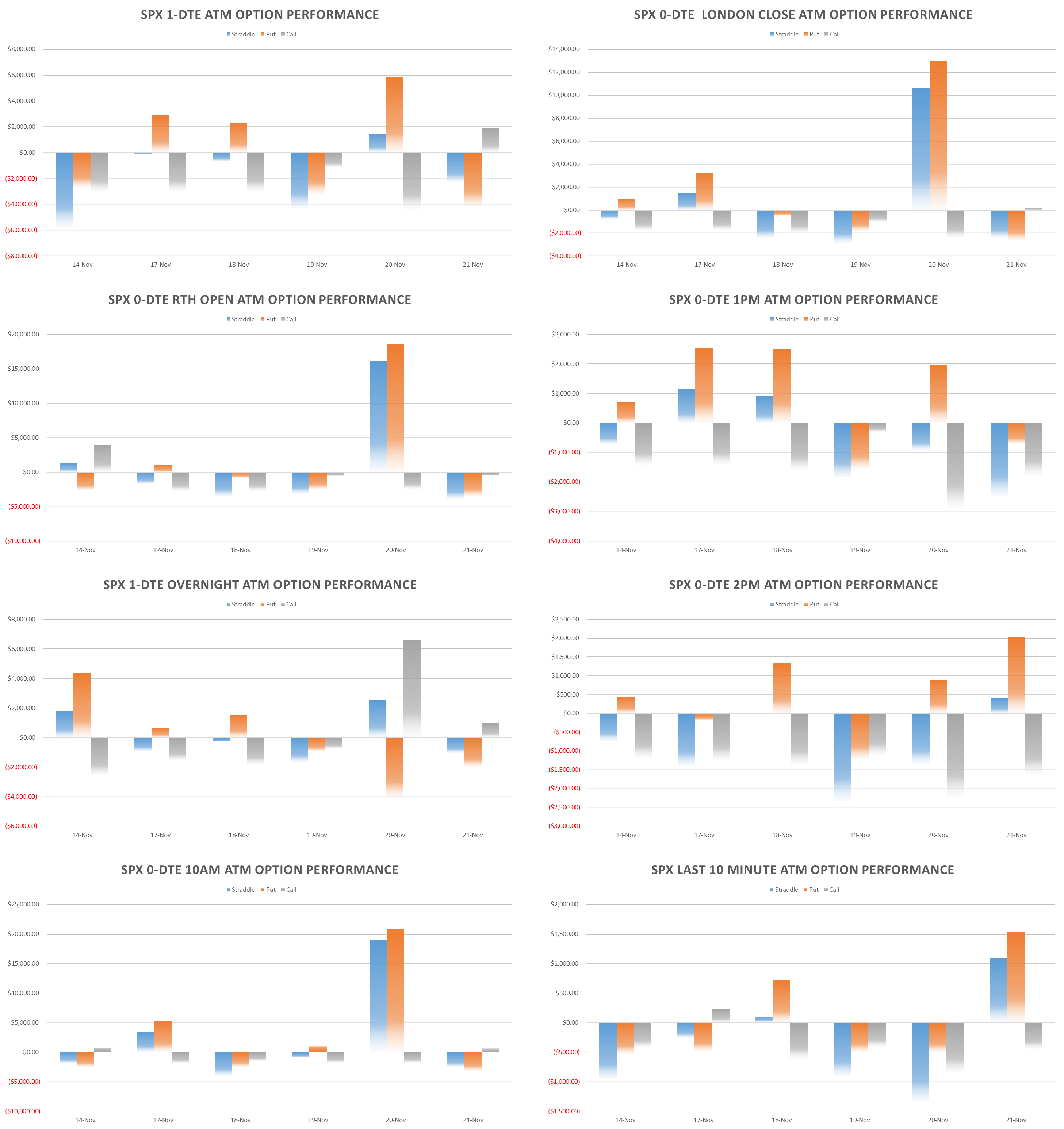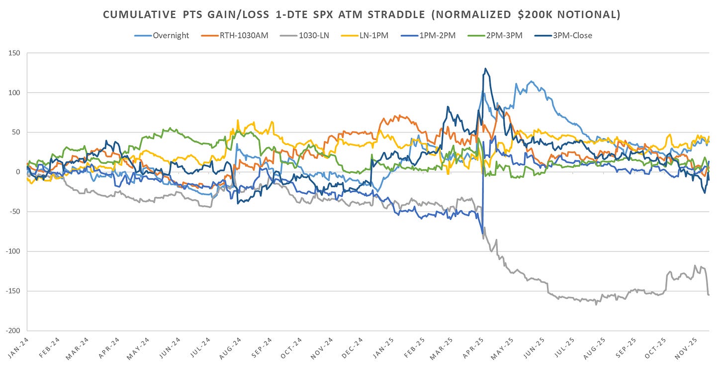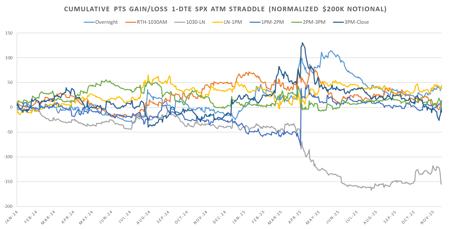 Despite record levels of intraday volatility, 1-DTE straddles net down ~116pts over last 6 trading days. Biggest wins came from straddles opened early in the session (9:30am/10am) for 50/132pts, respectively.