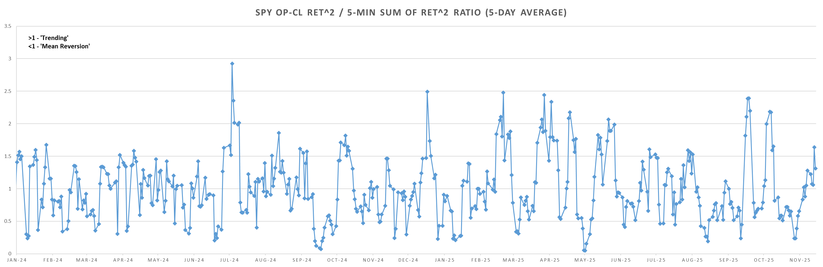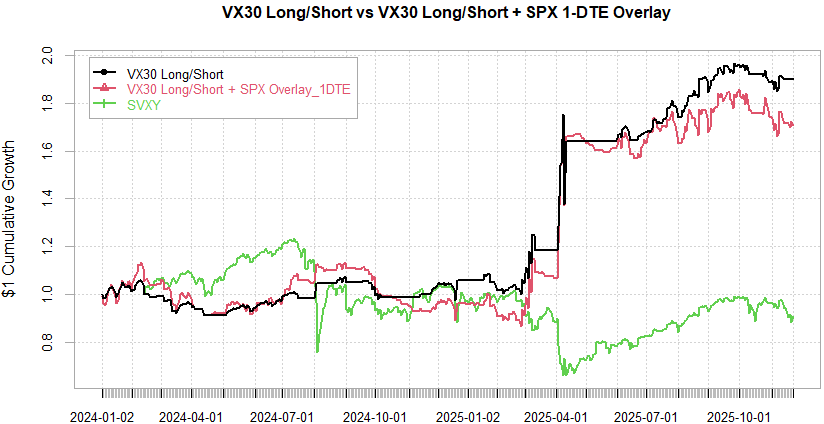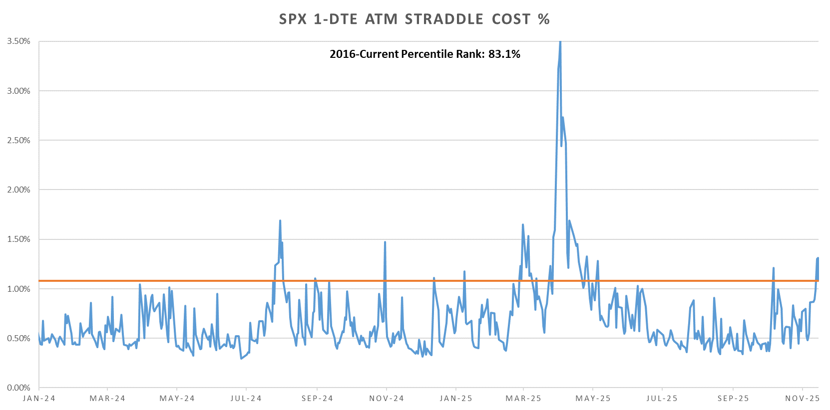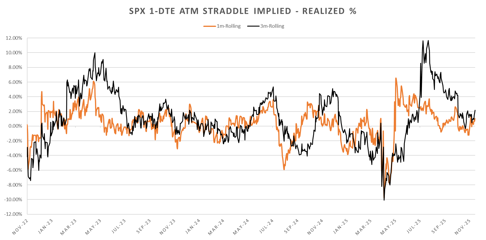 Even with the rally overnight last week and so far on Monday, cash signal sticky for the strategy. Dec VIX lowest point on the curve (as expected Dec contract always depressed) with the rest of the curve ~22 well into summer 2026. So far every early week rally has been sold into heavily last 3-4 weeks. I don’t see much juice in shorting VX here relative to short dated SPX straddles, considering VX is likely to stay bid at least until FOMC, while short dated straddles are getting a boost from slightly elevated short dated implied correlations.