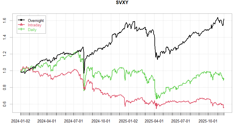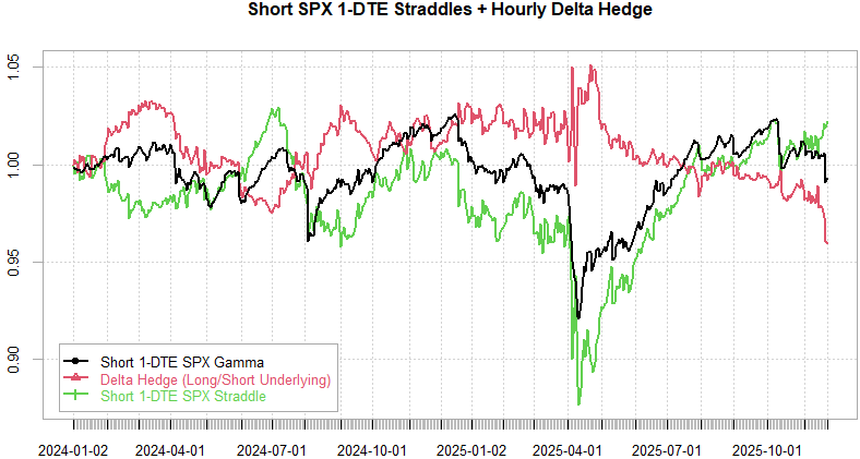 Large divergence last week between delta hedged / unhedged 1-DTE SPX straddles as majority of the vol realized intraday rather than cl-cl basis. Systematically selling unhedged 1-DTE straddles hit peak pnl for the year last week even as VIX hit nearly 30 & indices had 4%+ intraday reversals.