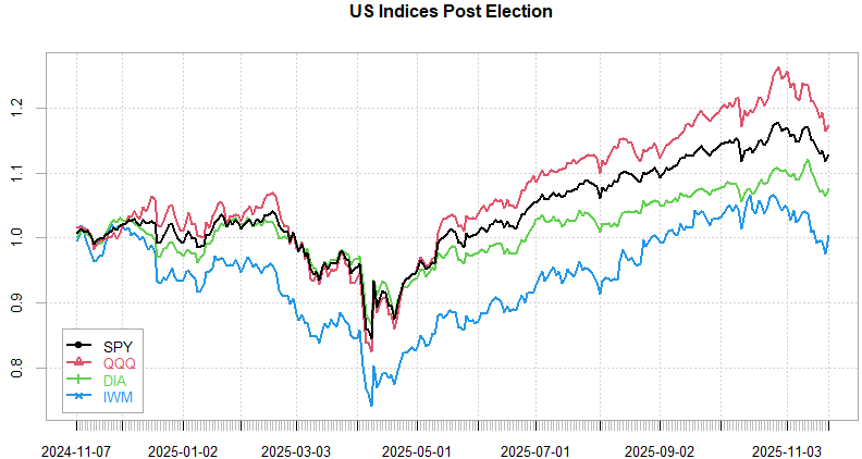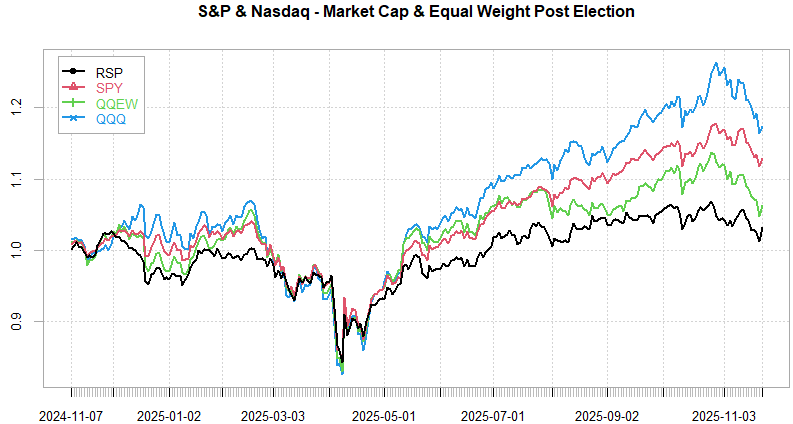 With only 3 full trading weeks remaining in 2025, we’re going into a historically positive period for equity markets. S&P ended the week once again bouncing off lows into Friday, touching ~5% dd from peak on Thursday. Main damage is coming from large cap tech, down ~11-12% as a basket from highs. VIX spiked near 30 on Thursday, running well ahead of realized vol. NVDA earnings came out strong, with Jensen, supposedly, in a leaked memo claimed NVDA is literally holding the planet together. Bessent earlier this weekend also mentioned that interest rate sensitive sectors are suffering, but, 2026 growth prospects looking ok… More of the same… narrow tech led rally with broader economy struggling. We are due for a slew of econ data releases throughout the week due to the backlog caused by the shutdown so despite it being a short week, should be plenty of action.