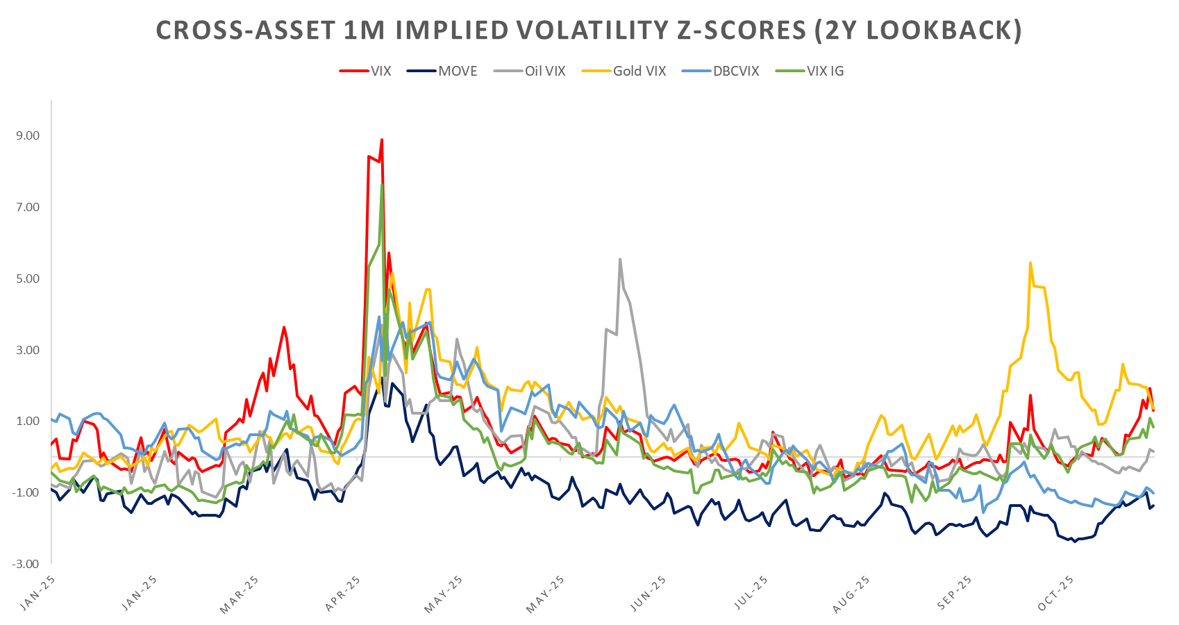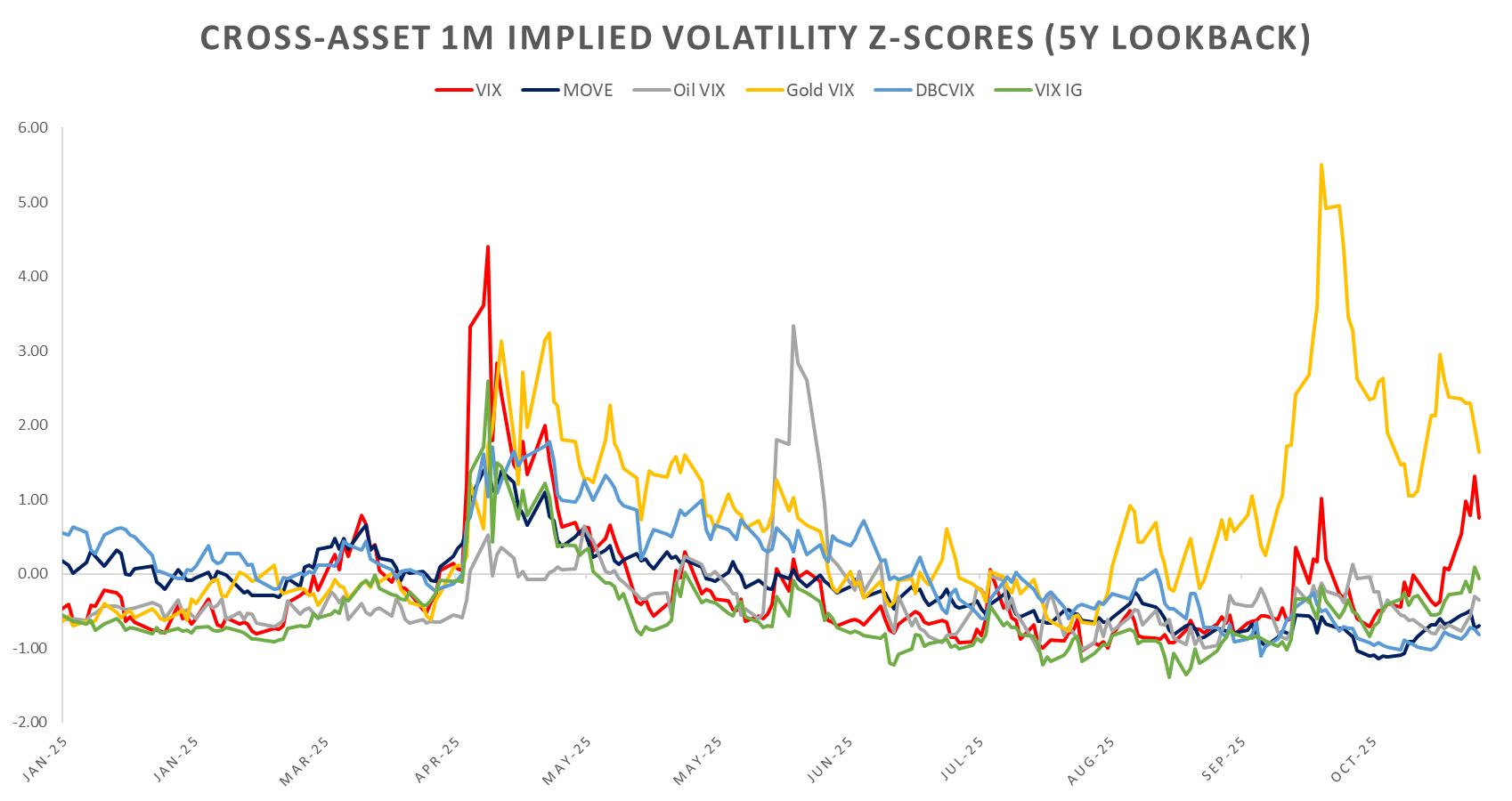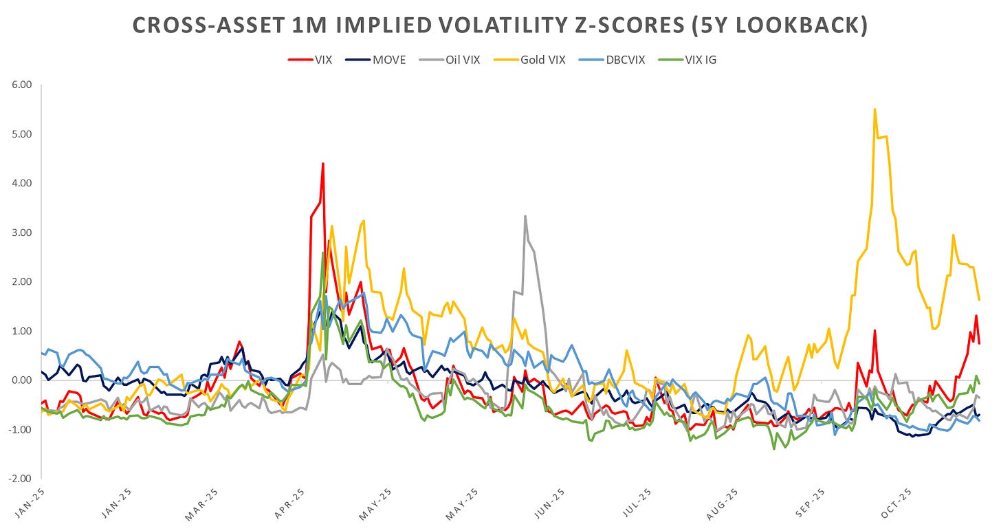Cross asset vols higher across the board except for gold. Equity vol showing up as the clear outlier, highest on a relative basis.