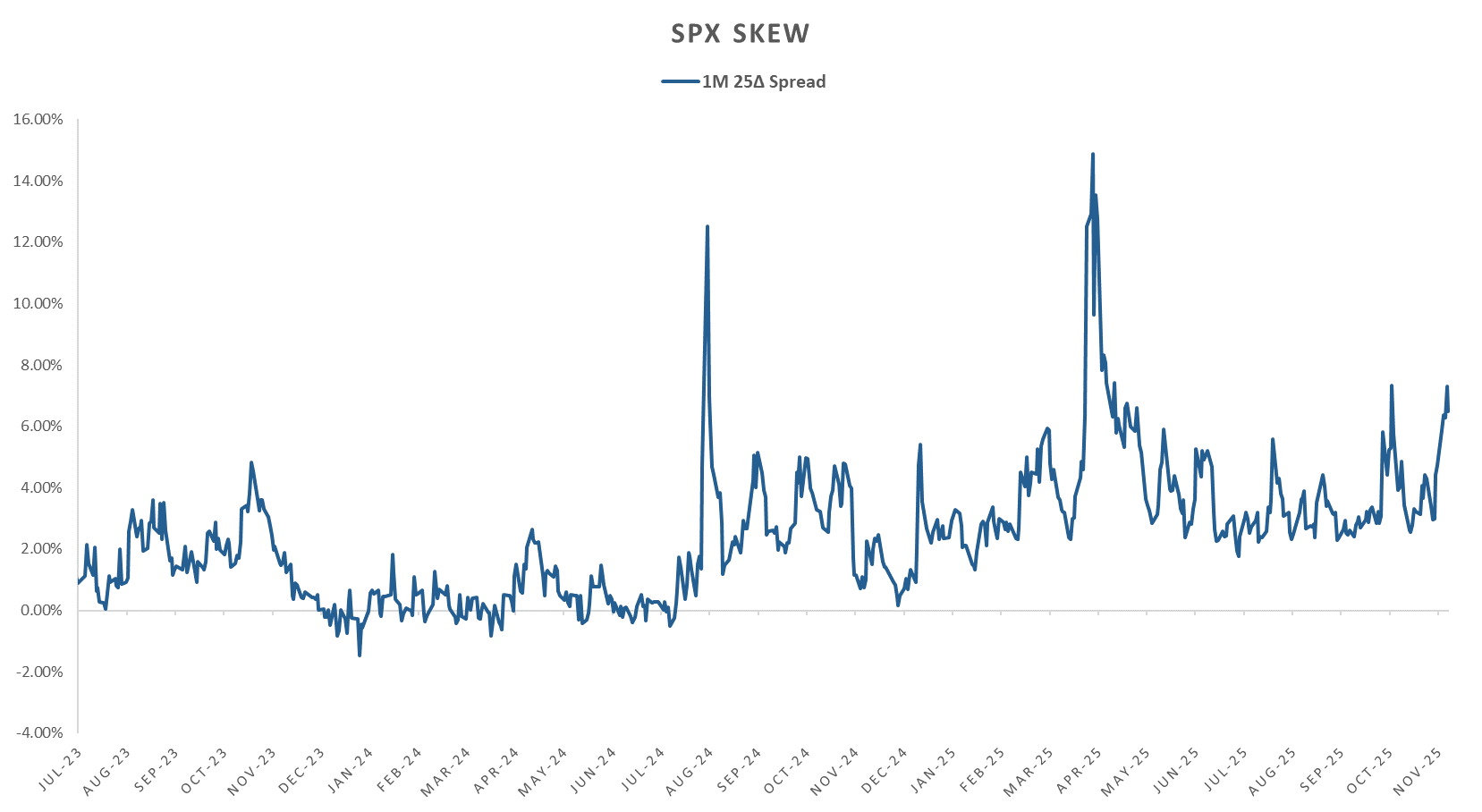 SPX 25d skew back to Oct highs. Recent comments by fed / admin officials as well as lack of data for a fed that claims to be data dependent leading to increased uncertainty surrounding Dec rate cut odds.