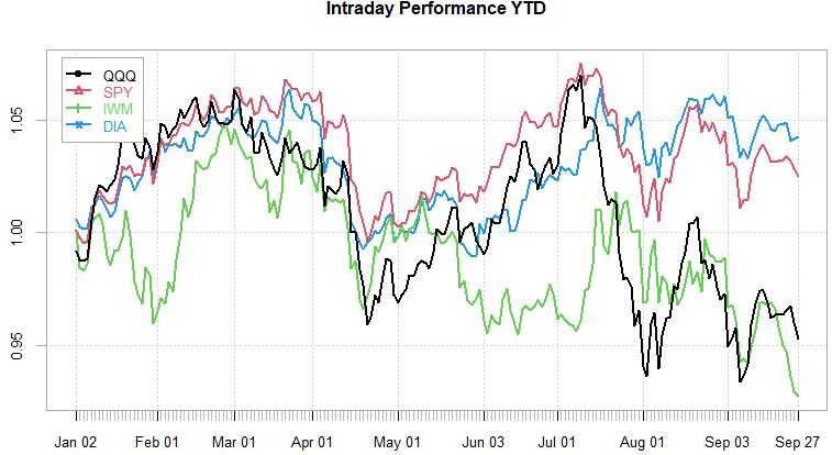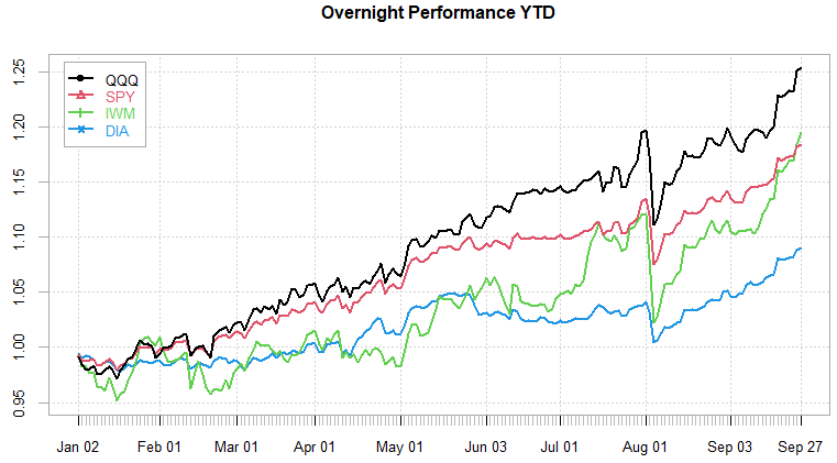 Out of the major indices, QQQ leading the overnight perf, DIA leading the intraday perf.