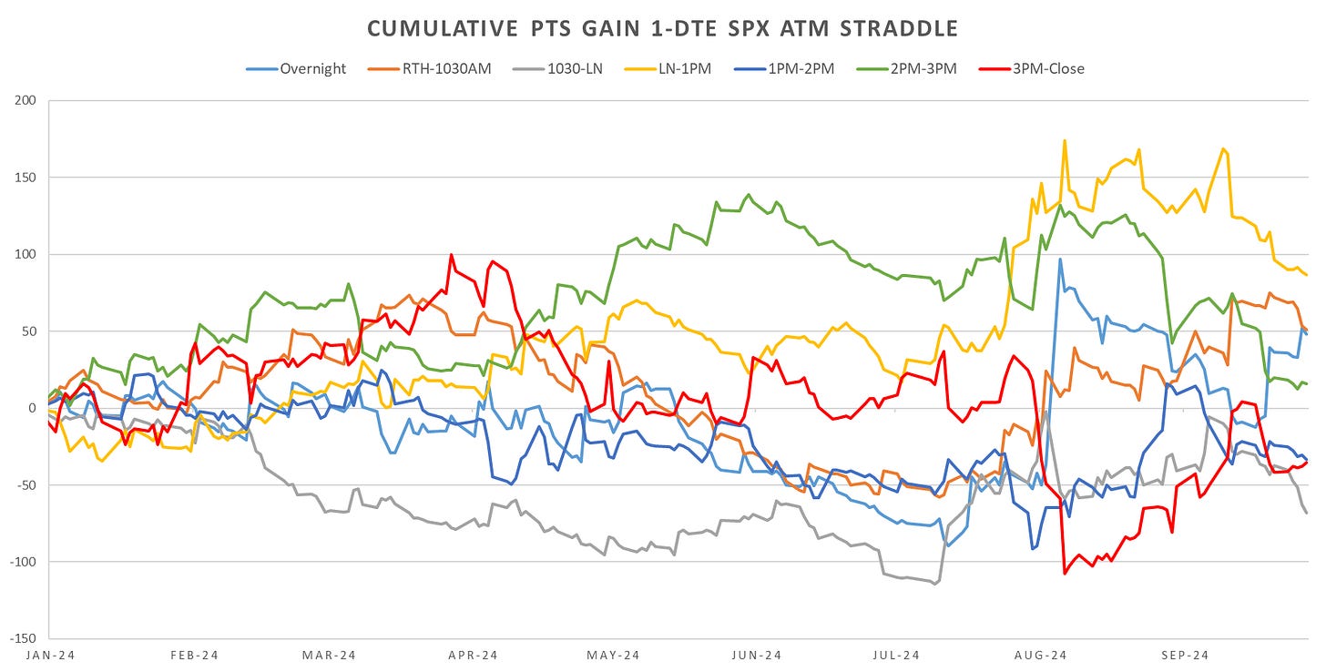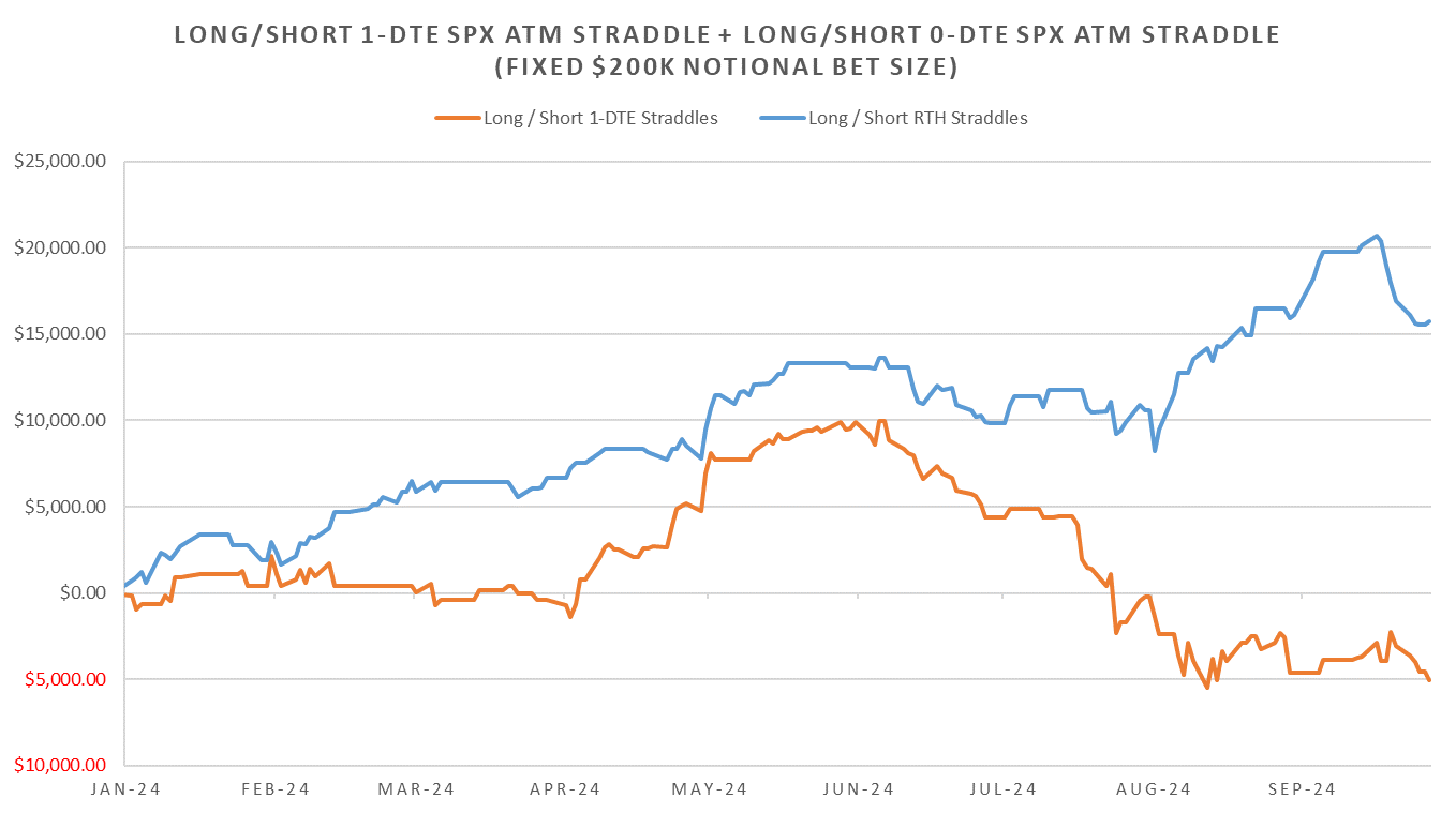 This time around the RTH leg of the trade switched to short RTH straddles on Thursday. 1-DTE leg still long 1-DTE straddles for Monday (short RTH & long 1-DTE.)