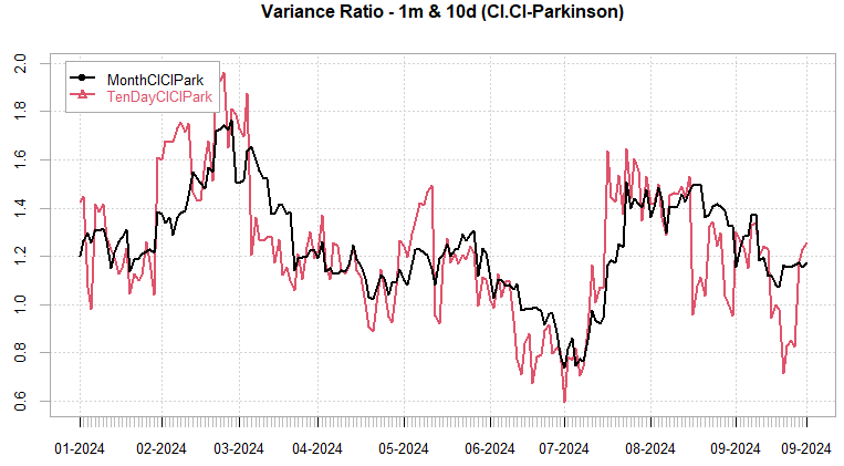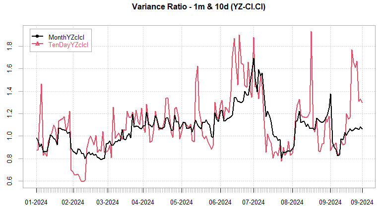 Variance Ratios have normalized as the more efficient rvol measures have caught down to the cl-cl measure. As of Thursday close, flipped expectations from intraday trend to intraday mean reversion but with larger cl-cl moves. Logic behind this is high mean reversion on a cl-cl basis but with large ranges, historically, tends to lead to range expansion & good long 1-DTE straddle performance going forward.