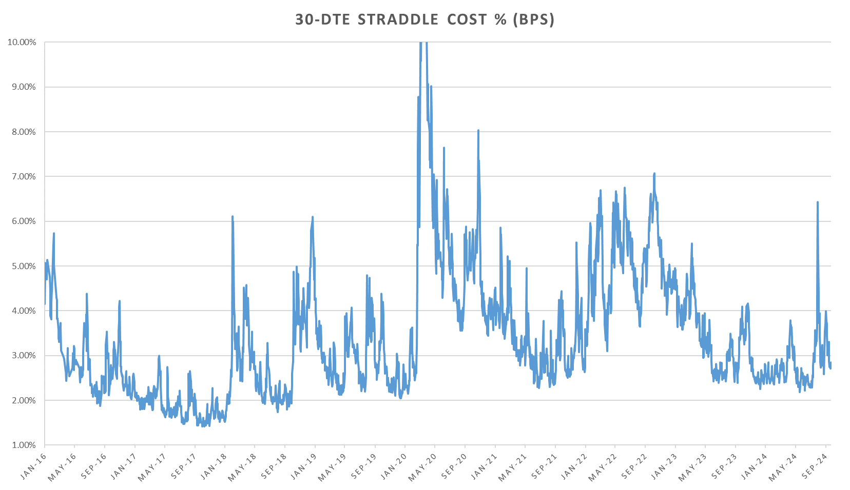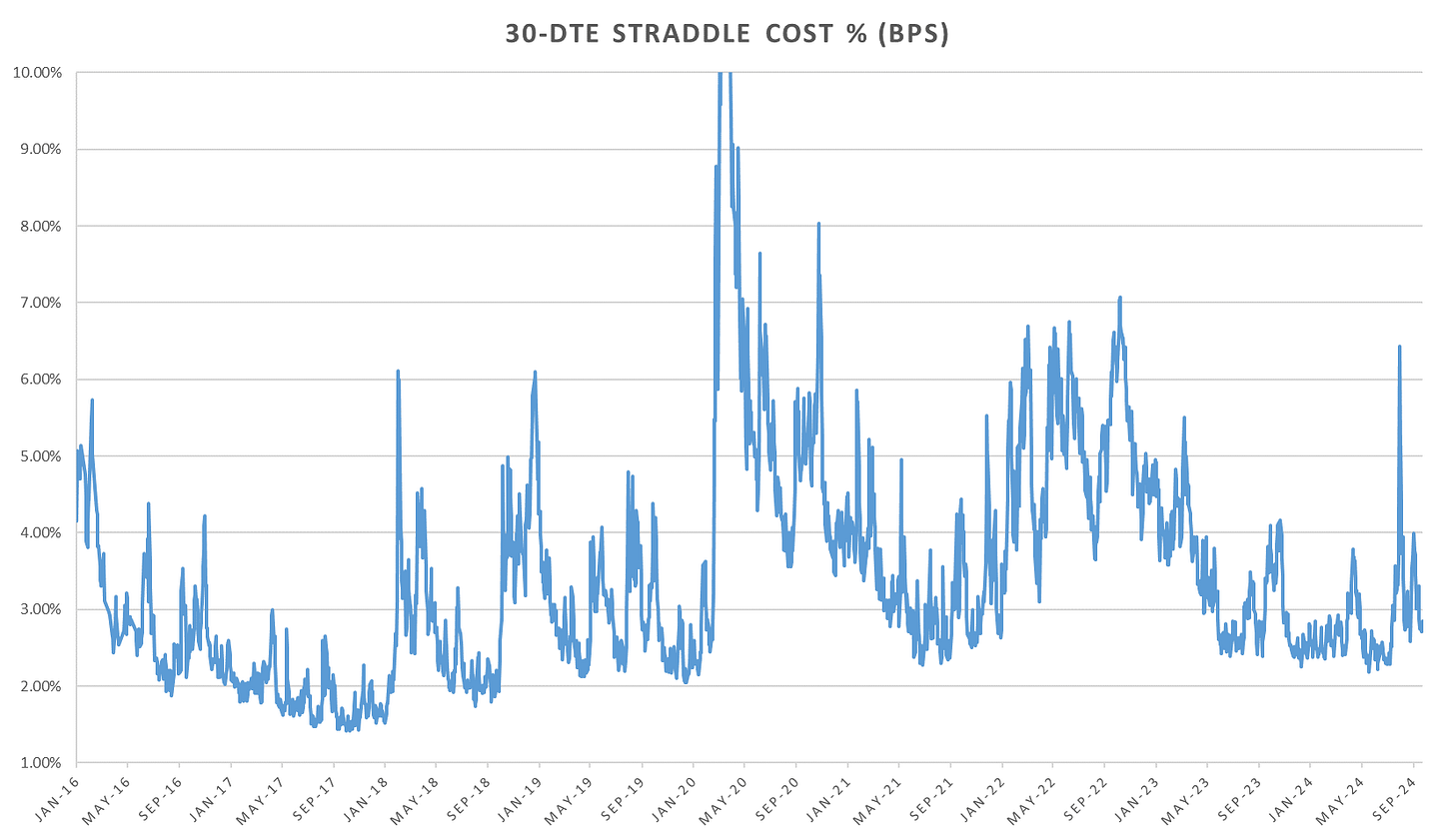30-DTE straddles not quite covering the election yet but not following the short dated vol lower, holding ~August post BoJ lows.