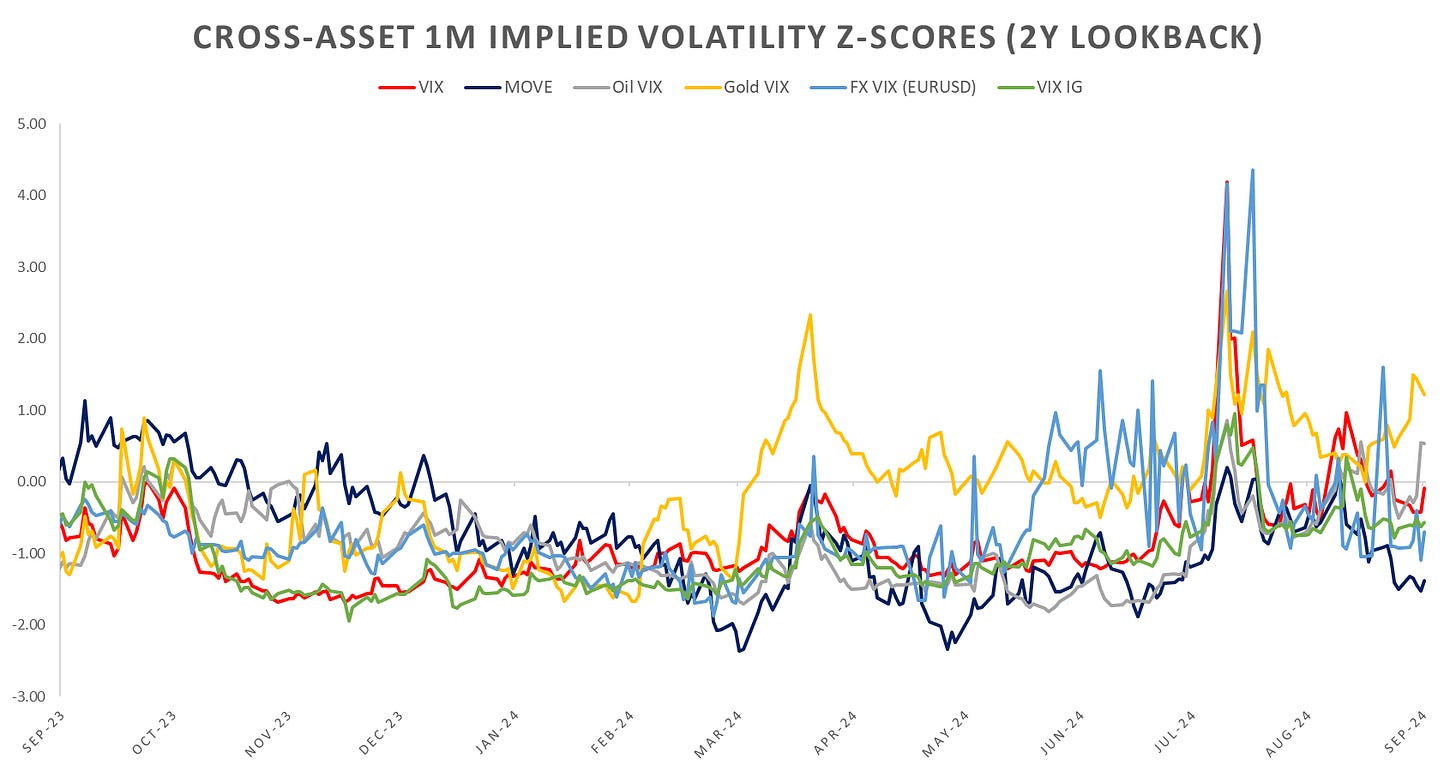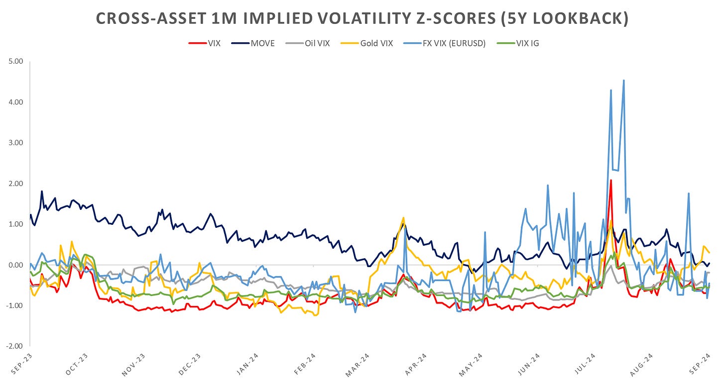 In terms of cross-asset vol, MOVE back down to summer lows after the 50bps cut, gold & oil having the biggest jump w/w as Middle East continues to be in the spotlight.