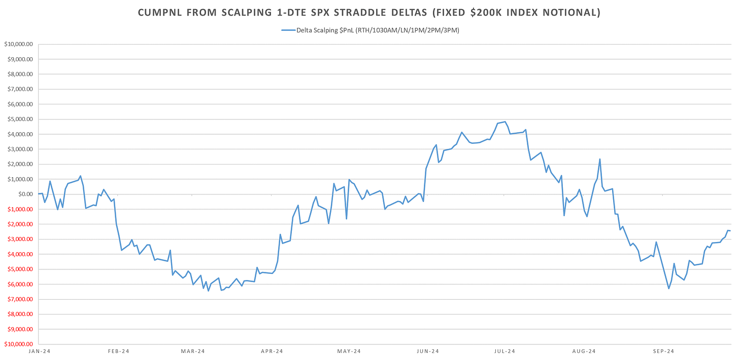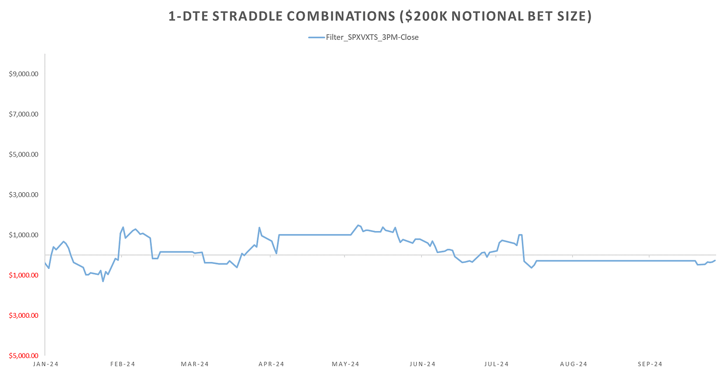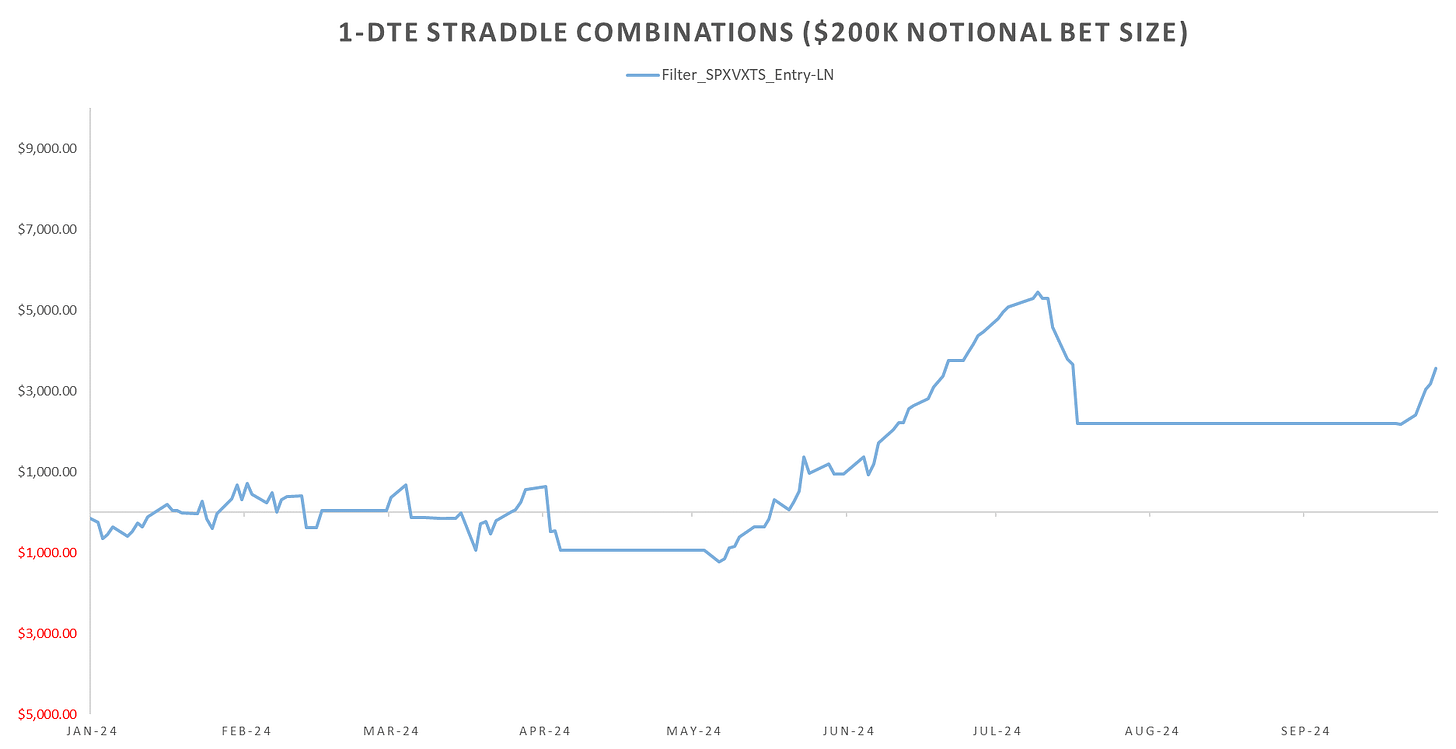 Outside of the overnight moves & the RTH-1030AM mean reversion straddles just kept bleeding. In the last post I mentioned that filtering the short 1-DTE Straddle till London Close trade by SPXVXTS shape filtered out a lot of the downside. This week ~1400$ pnl on $200k notional bet size (~70 bps).