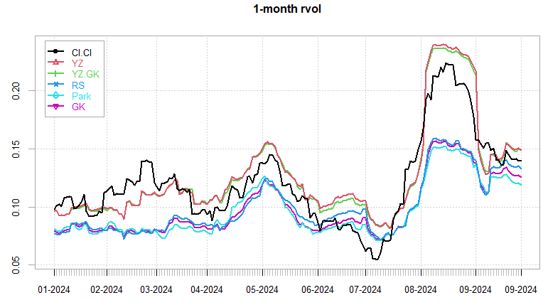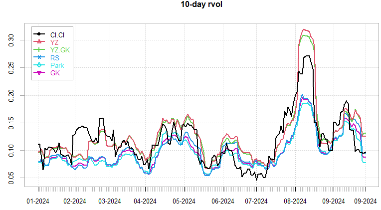 10-day rvol dipped below 10 once again on most measures. YZ holding closer to 15 as it takes into account the overnight moves. 1-month rvol circling around long term average here.
