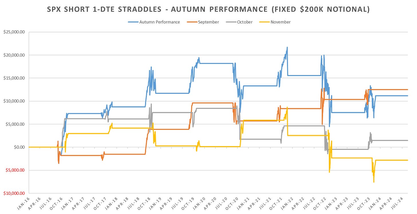 Looking at Autumn seasonality, we’ve passed the best part of the performance for short straddles, with Oct/Nov alot more rocky, especially given election headlines.