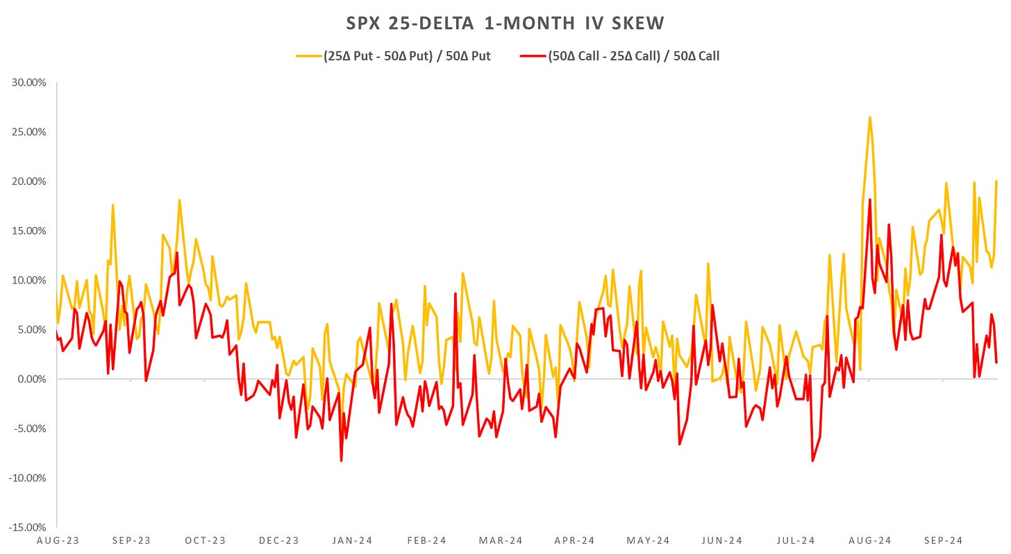 SPX skew continues to steepen, with upside skew flat & downside skew well bid (almost back to August highs.) Elevated downside skew should keep VIX in check on a relatively mild 3-4% downside move, so should not see panic moves like we’ve seen in August. Expect weaker VX beta relative to SPX moves to the downside, with ~flat VIX/VX on upside moves.