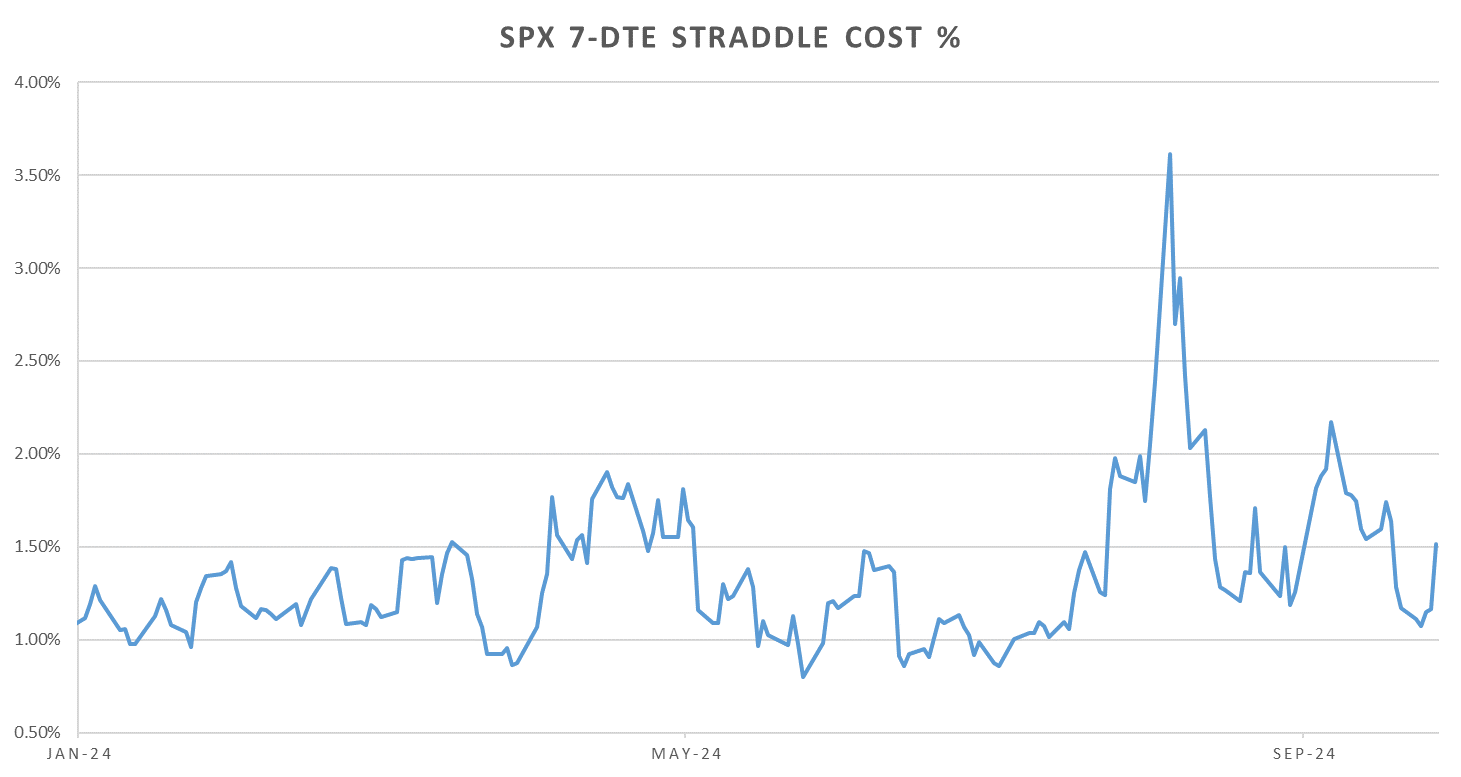 Weekly straddles also back up, driven mainly by the Friday Oct 4th premium for NFP & unemployment data (almost 40bps jump for 7-DTE straddle covering Friday from Thursday.)