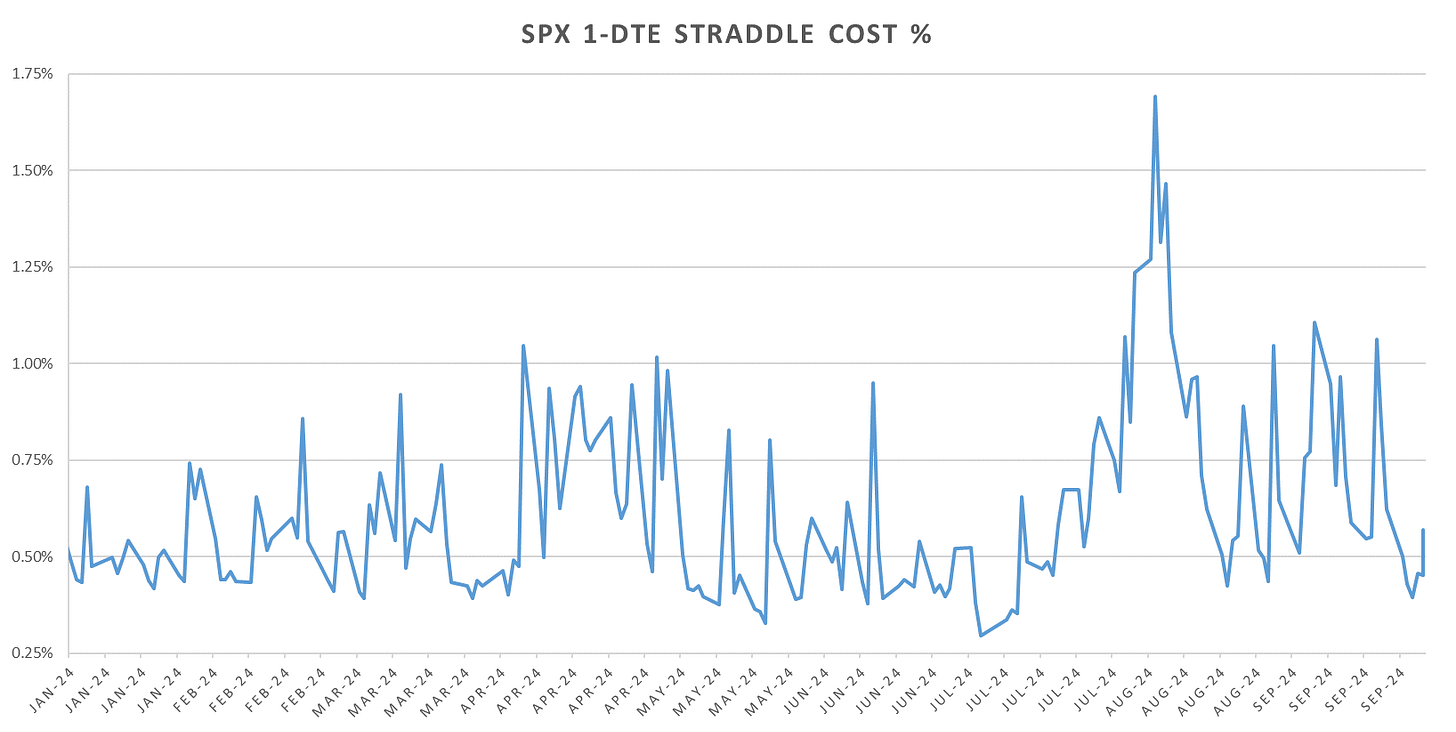 1-DTE Straddles briefly traded at around summer lows before going into the weekend at ~60bps on elevated geopol risk. Monday is also eom & eoq day so expecting a decent shot at long eod premium (will post the EoM trade overview on Monday.)