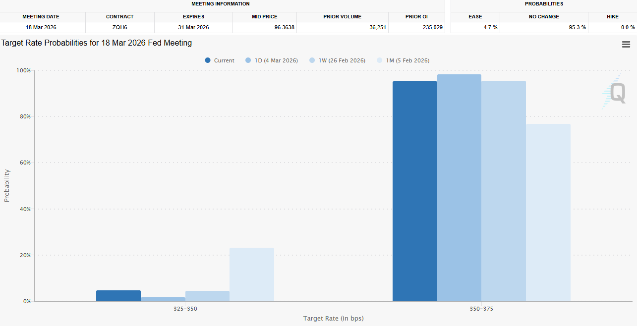 In terms of March FOMC, rate cut odds substantially lower from 1 month ago, almost certainly no cuts…