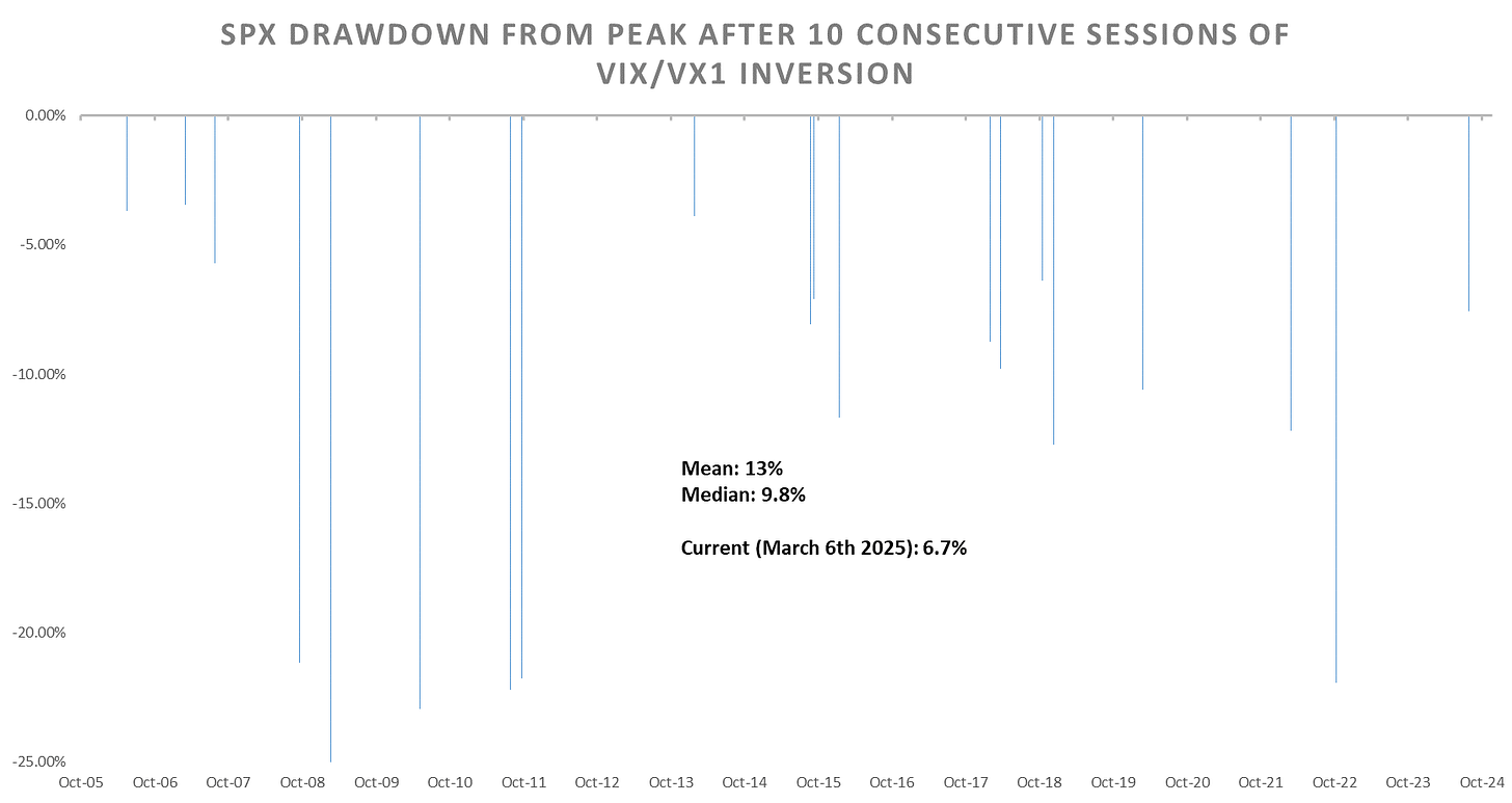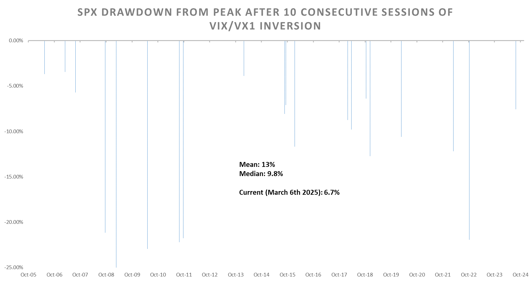 Given how long we are now seeing VIX/VX1 inversion, one of the more shallow SPX dips historically.